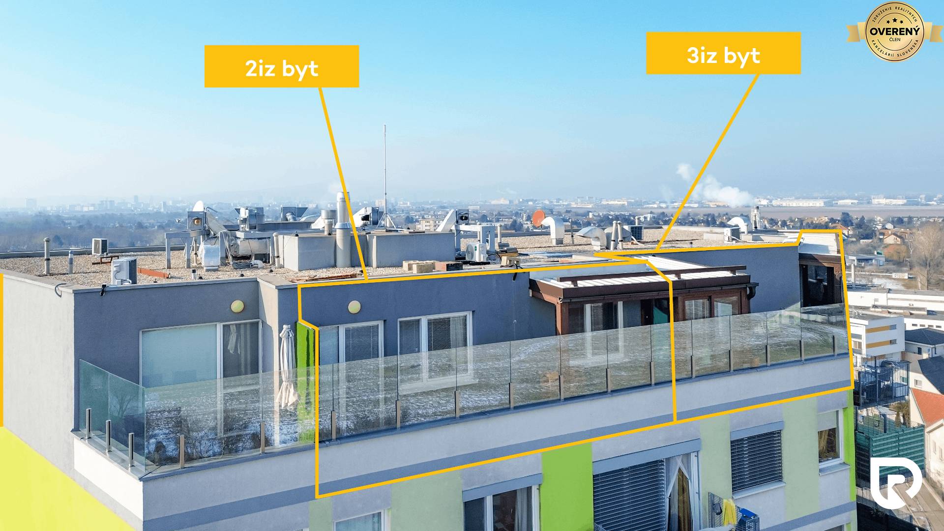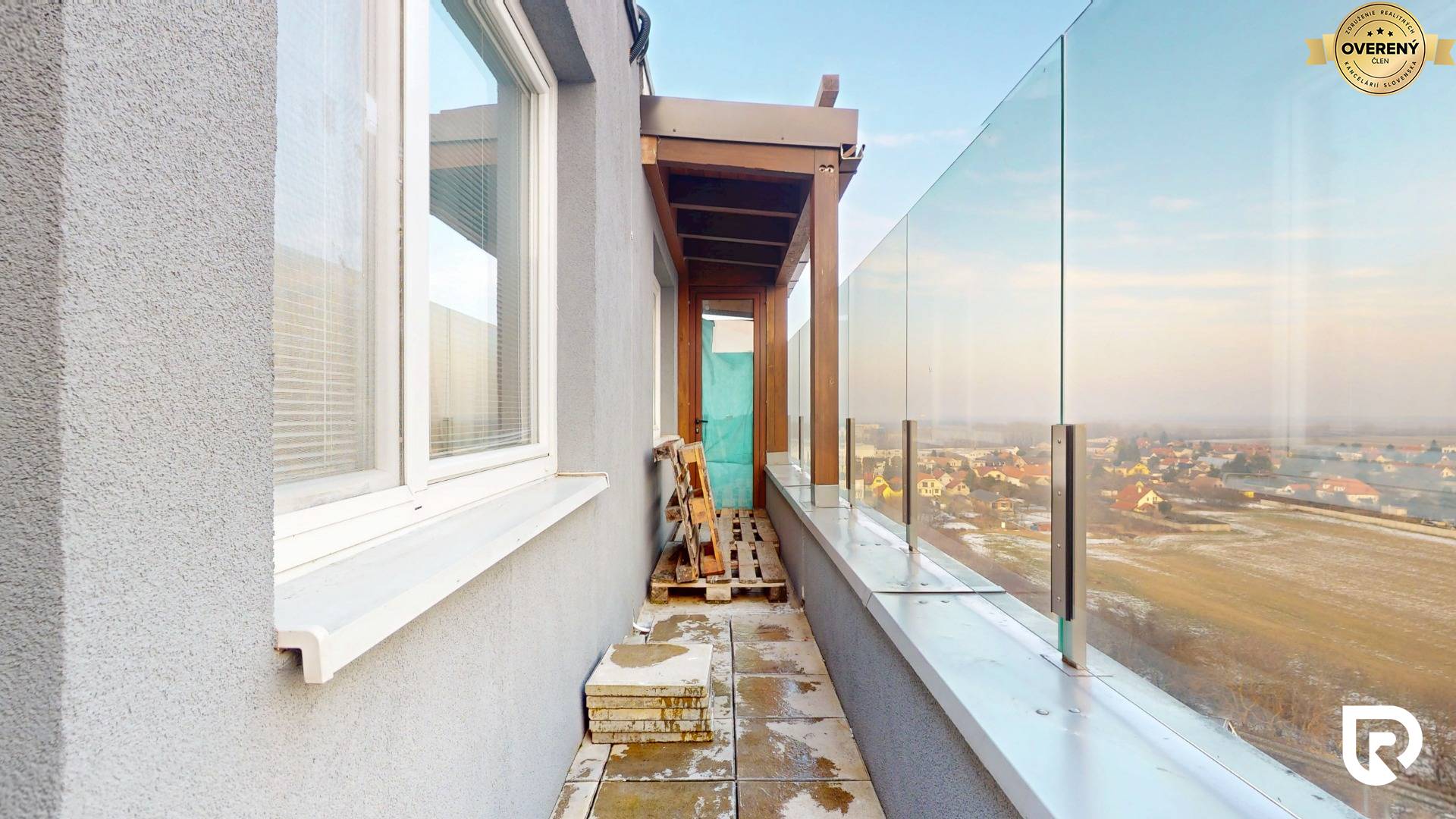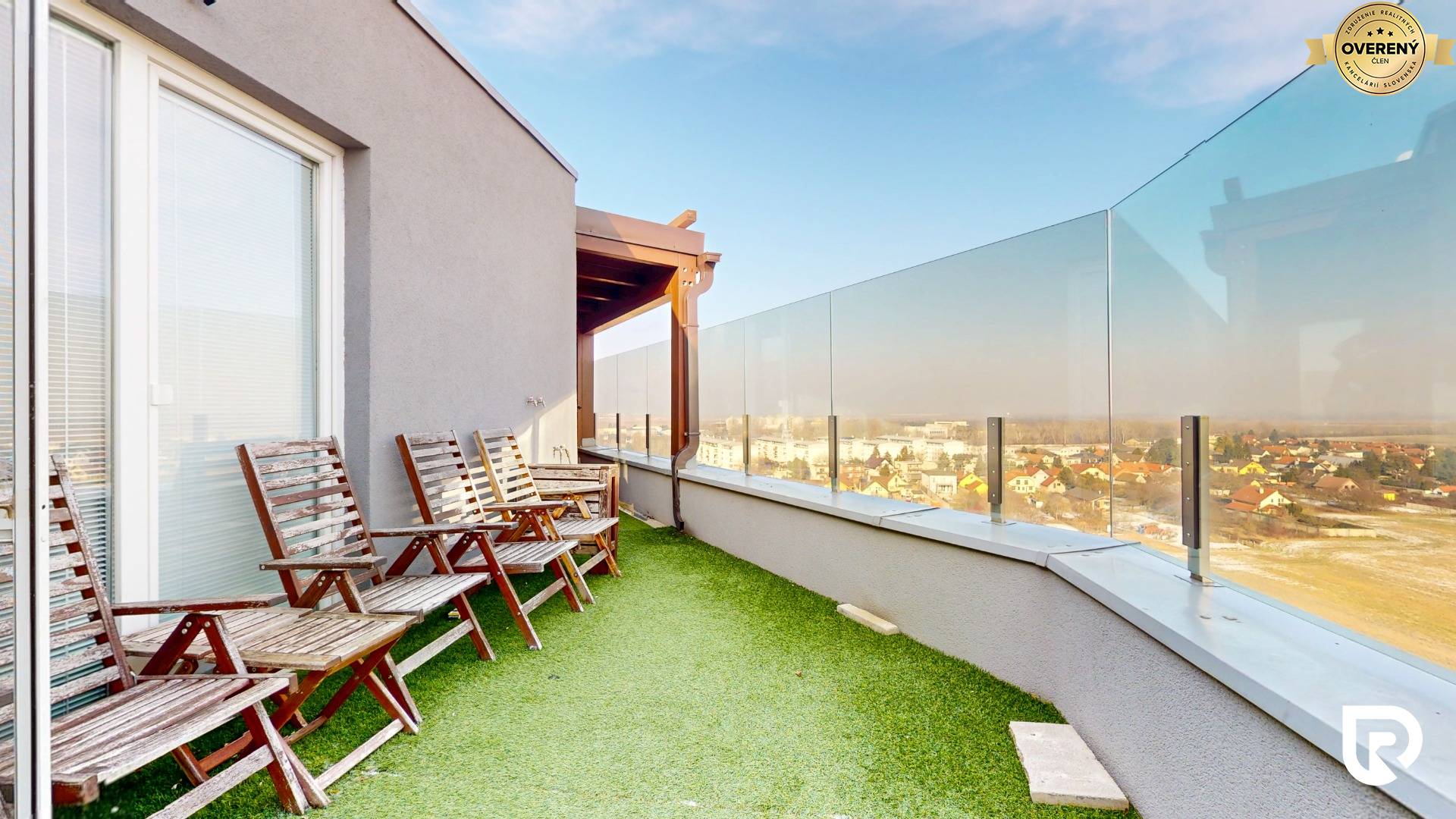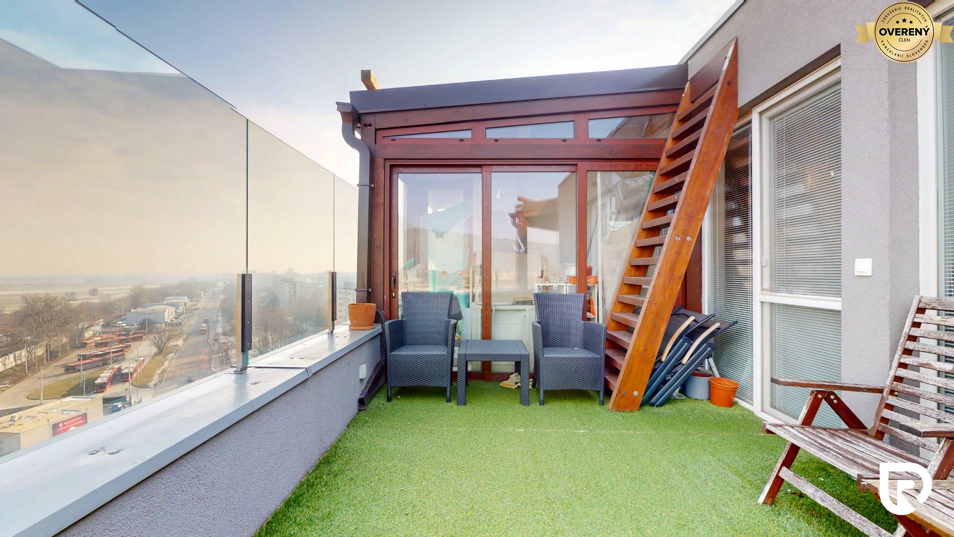 Najväčšou výhodou bytu je 22.32 m² zasklená terasa, kde si môžeš vychutnať rannú kávu s krásnym výhľadom na východ slnka. Použité je sklo Stopsol, ktoré chráni pred vetrom aj priamym slnkom, takže terasa je príjemná aj počas letných dní. Priestor ponúka možnosť zriadiť sprchu alebo saunu. Bonusom je aj výstup na strechu s nádhernými 360° výhľadmi na celú Bratislavu a jej okolie.