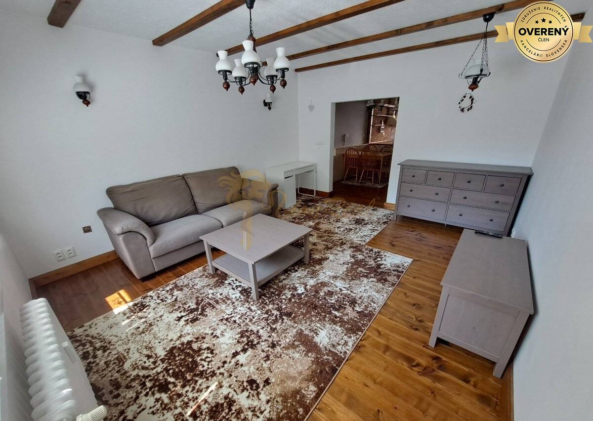 Podlaha v celom byte je z drevenej dlážkovice. na strope v obývacej časti sú drevené trámy v rovnakom dekore ako podlaha. Interiérové dvere sú rovnako drevené v rovnakom dekore.
