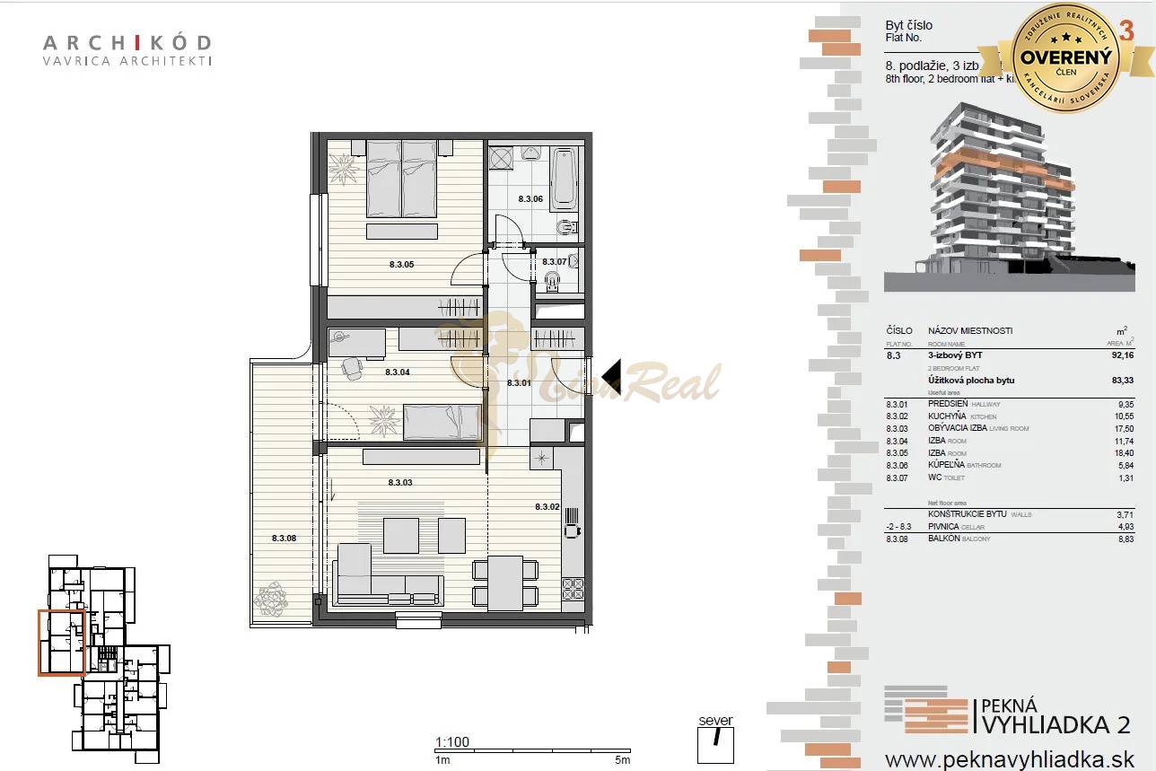 - Rozloha 74,69 m2 bytová jednotka + 8.83 m2 balkón + pivničná kobka 4.93 m2