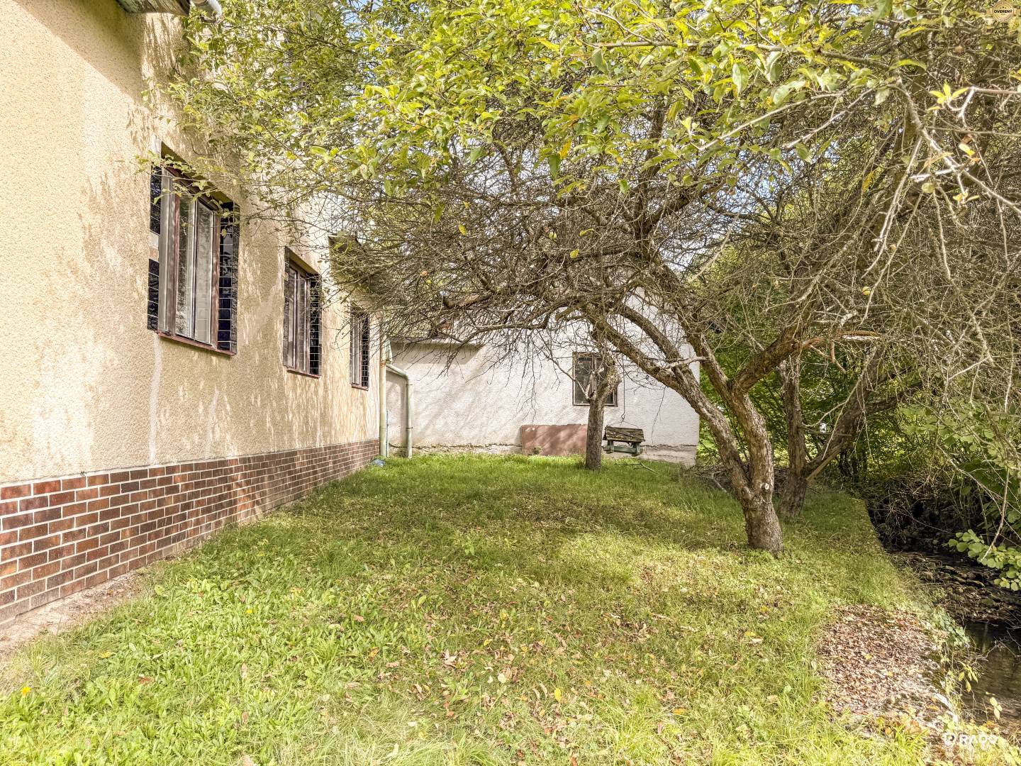 Na pozemku sa nachádza veľká brána, ktorou sa dá vojsť autom k hospodárskej budove. K hospodárskej budove je vybetónovaný chodník. Spredu je dom oplotený, má vstupnú bránku, predzáhradku a hneď vedľa sa nachádza garáž. Zo zadnej strany domu tečie potôčik, pri ktorom si môžete spríjemniť horúce letné dni. Na pozemku sú rôzne stromy, pozemok je rovinatý a zatrávnený.