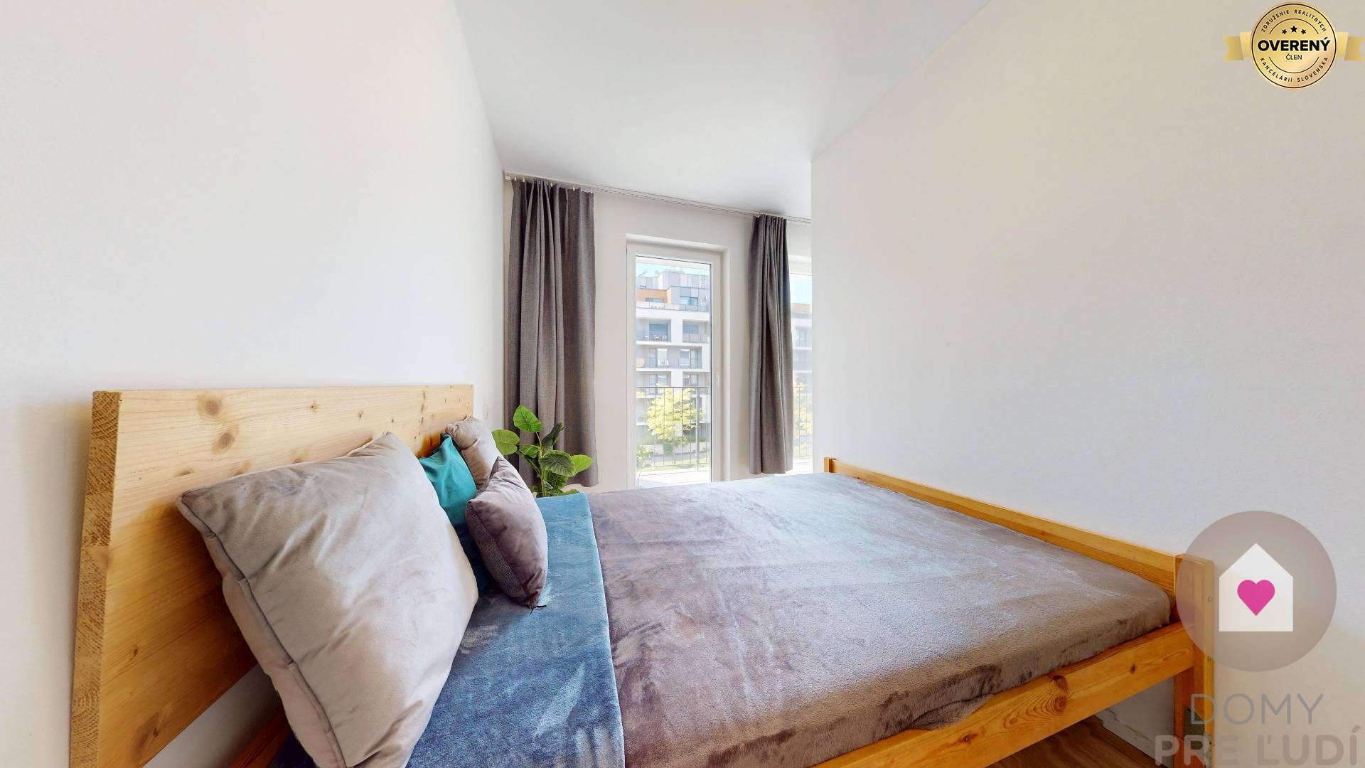 - oddelenej spacej časti priečkou, kde je situovaná manželská posteľ (140cm) a vstavaná skriňa, ktorá nie je na foto, ale v byte už je spravená.
