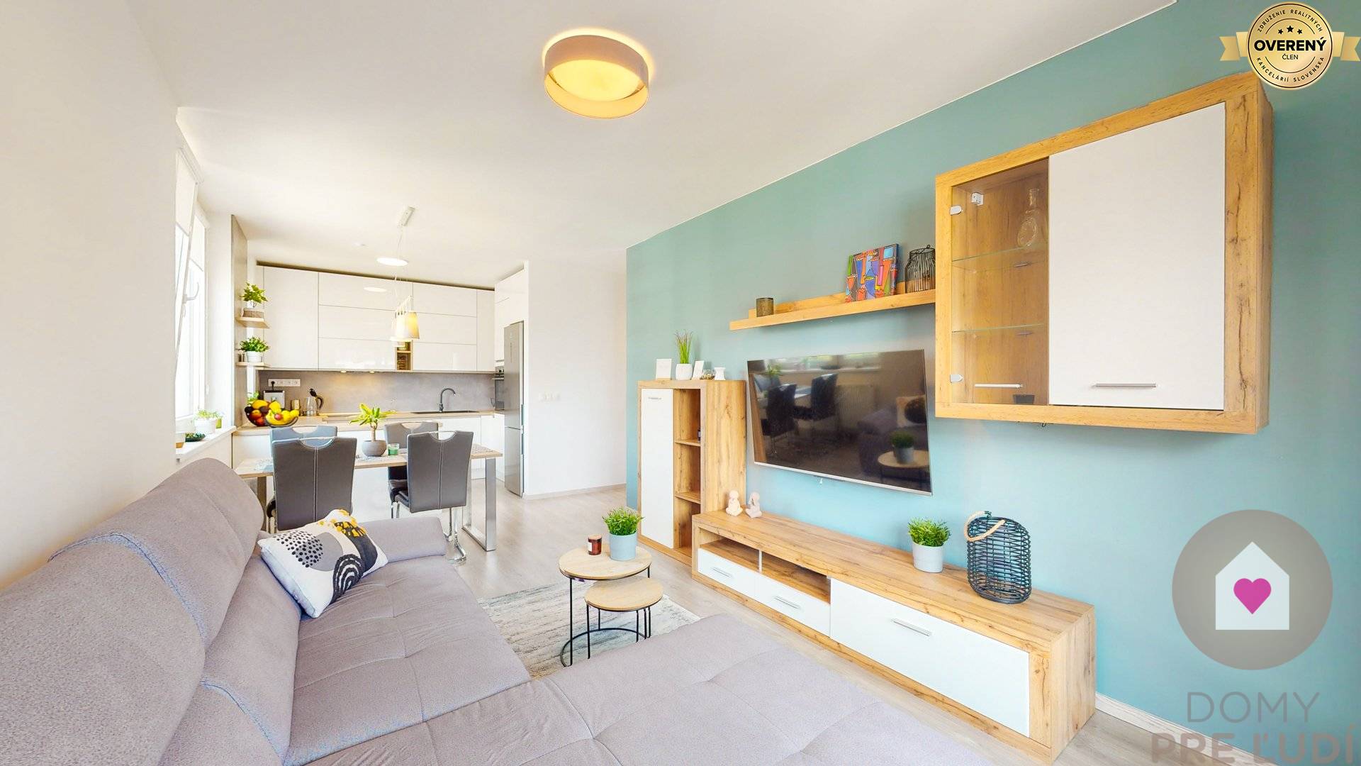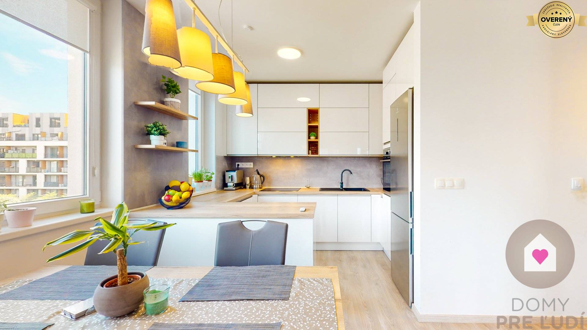 - kompletne zariadená kuchynská linka oddelená od obývačky, nakoľko je situovaná vo výklenku - vstavaná chladnička s mrazničkou, mikrovlnná rúra, elektrická rúra, indukčná varná doska, umývačka riadu a digestor