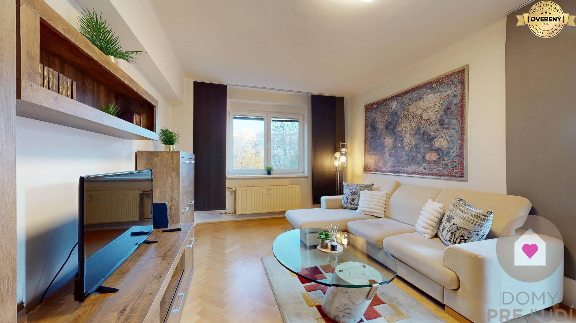 - priestrannou obývacou izbou, v ktorej sa nachádza sedačka, konferenčný stolík, koberec, obývačková skrinková zostava, TV, pracovný stolík so stoličkou, stojaca lampa a vychádza sa z nej na francúzsky balkónik (0,8 m2),