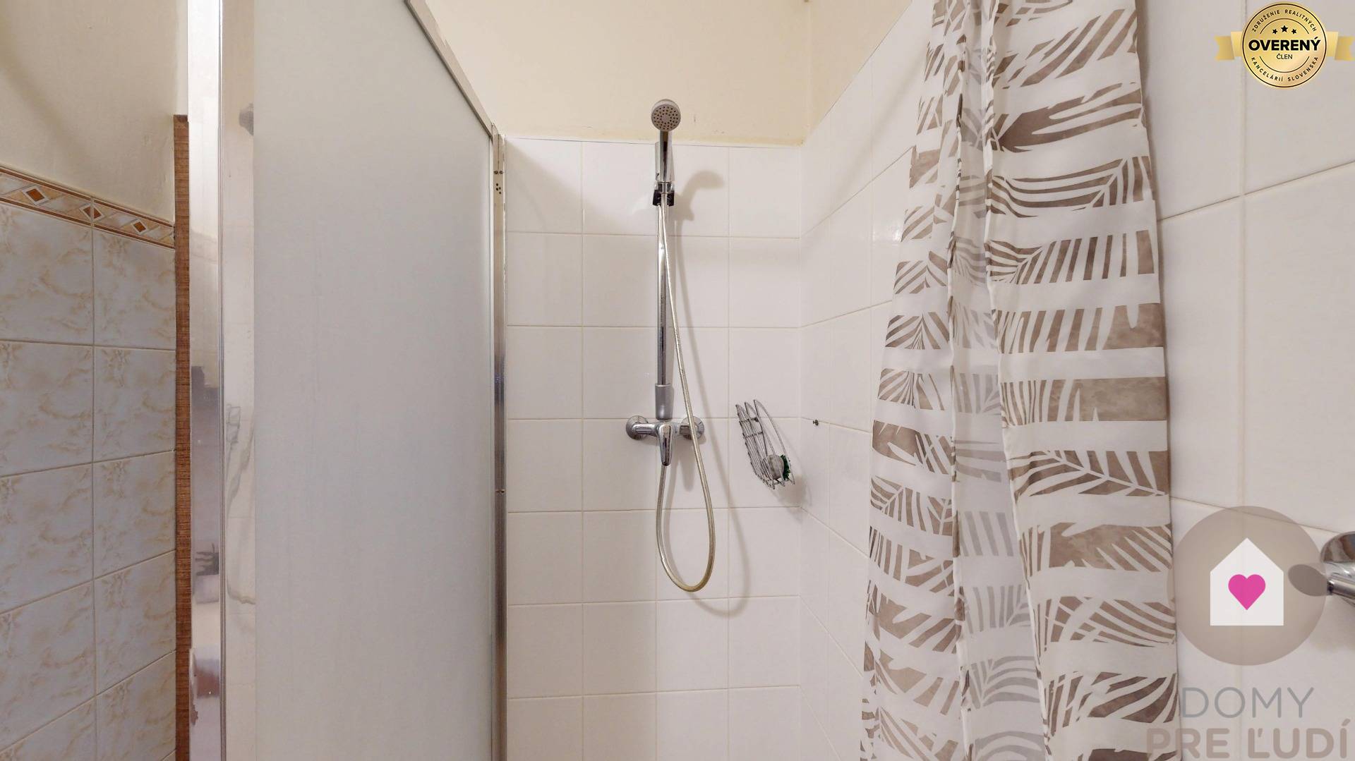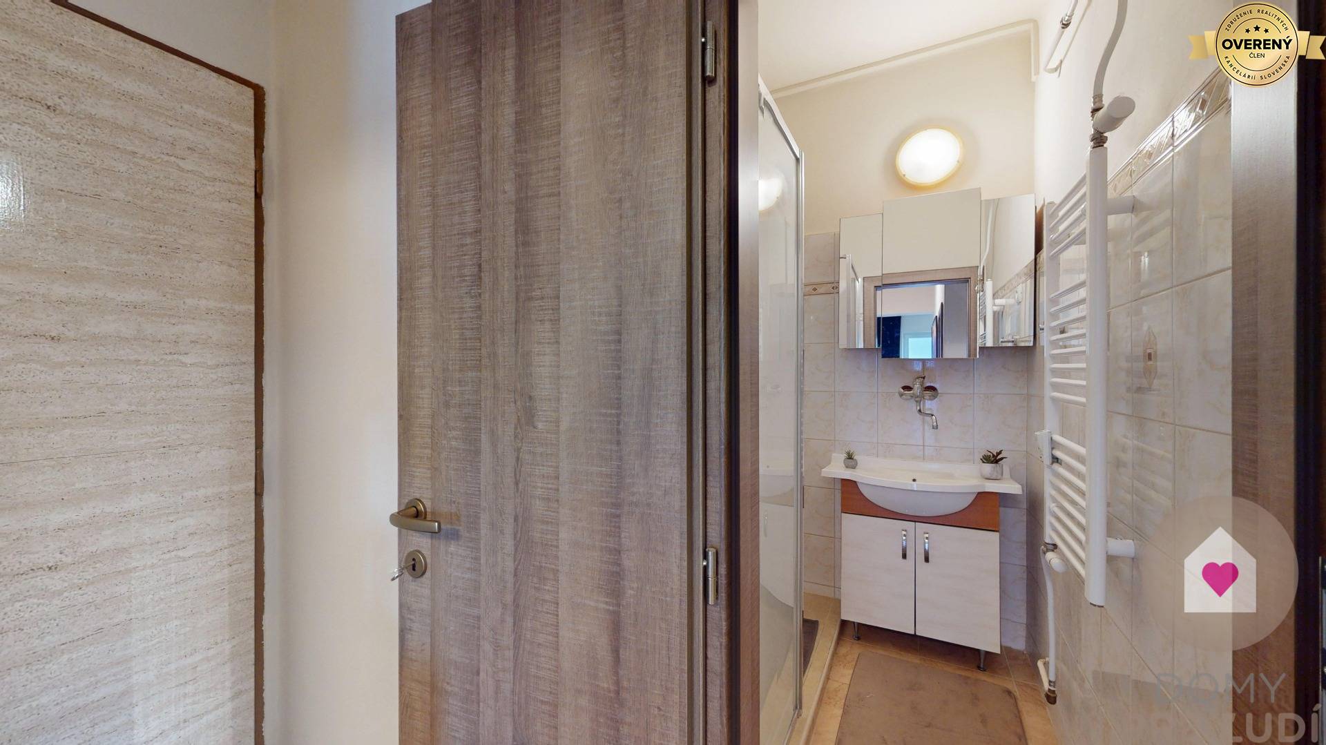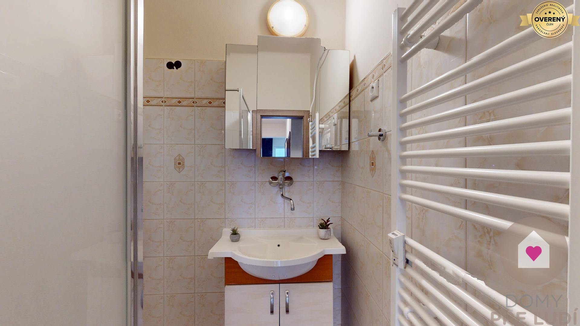 - kúpeľňou so sprchovým kútom, umývadlom, zrkadlovou skrinkou a skrinkou pod umývadlom,