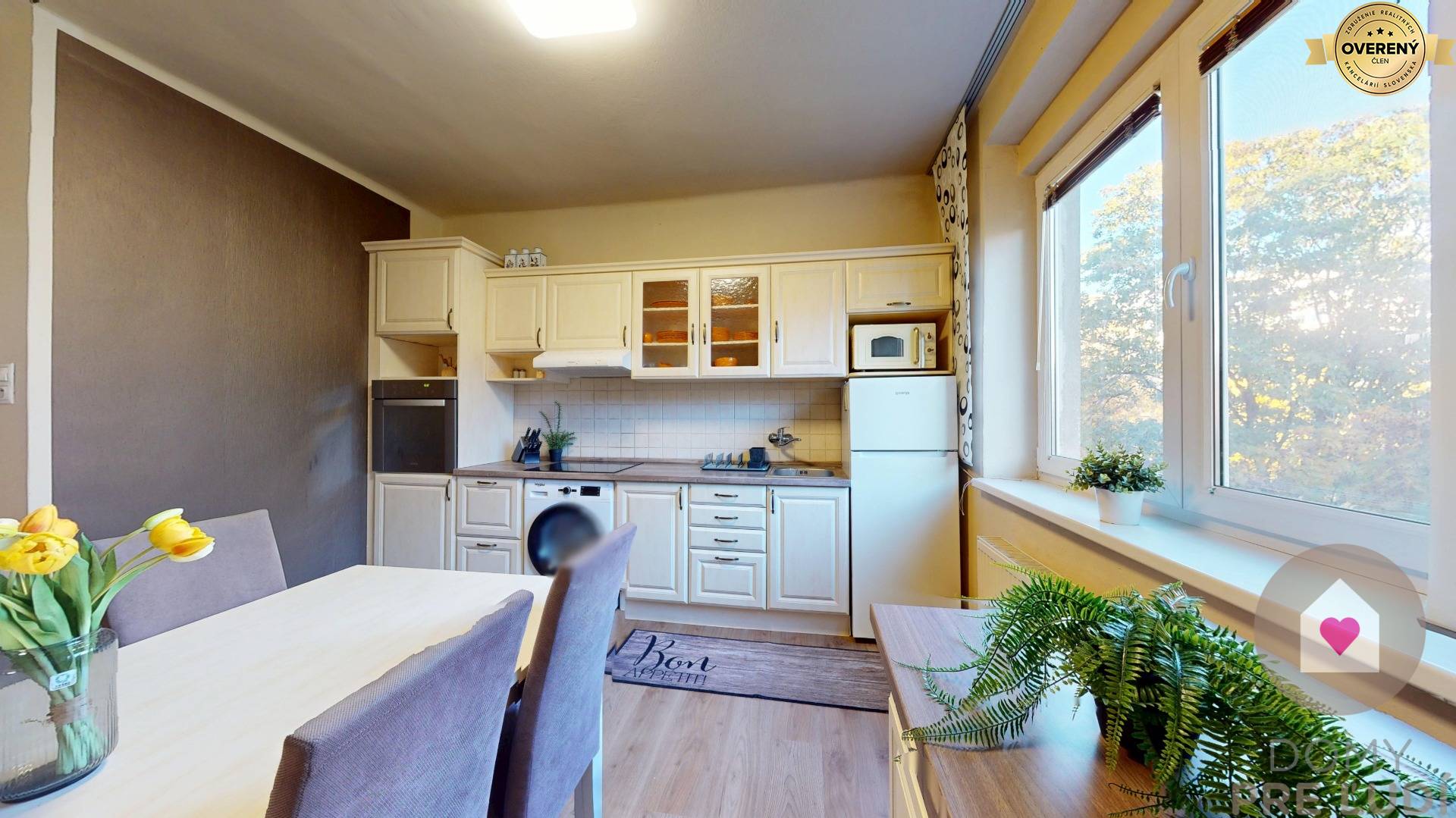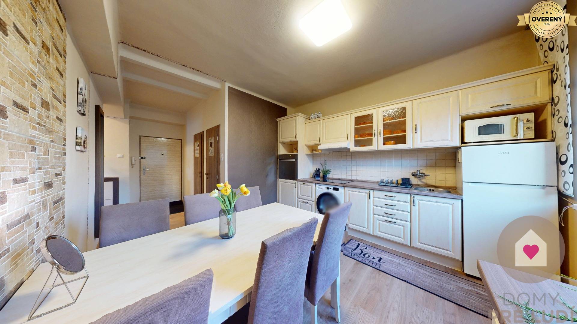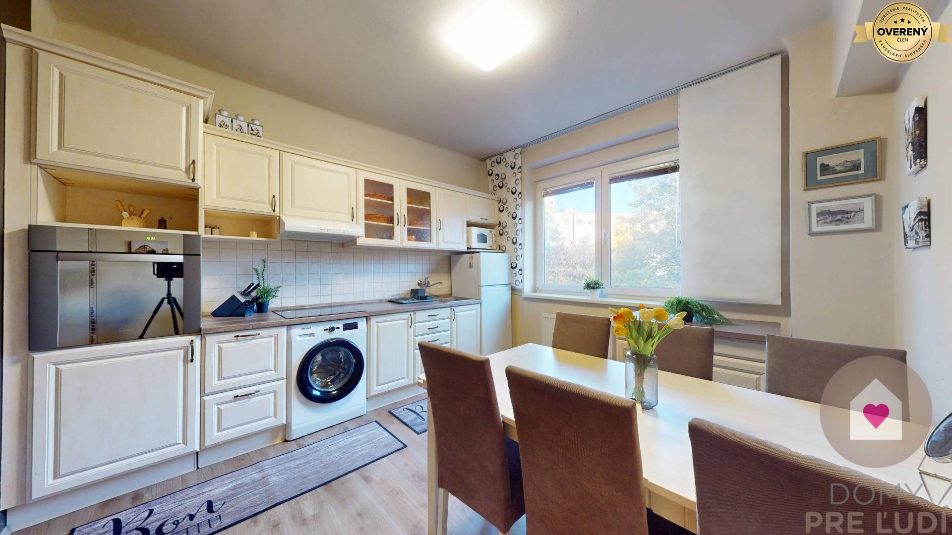 - samostatnou plne vybavenou kuchyňou - kuchynská linka robená na mieru so zabudovanými spotrebičmi (varná doska, el. rúra, digestor), samostatne stojaca chladnička s mrazničkou, mikrovlnka a práčka, jedálenský stôl so 6 stoličkami a je vybavená aj riadom a komplet kuch. náčiním,