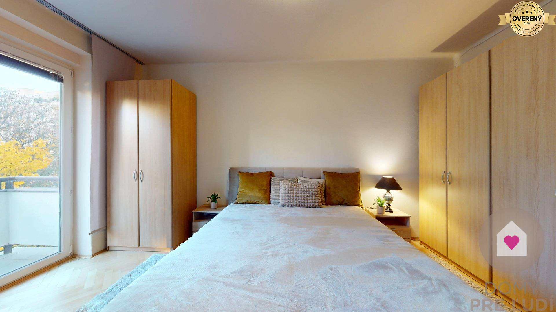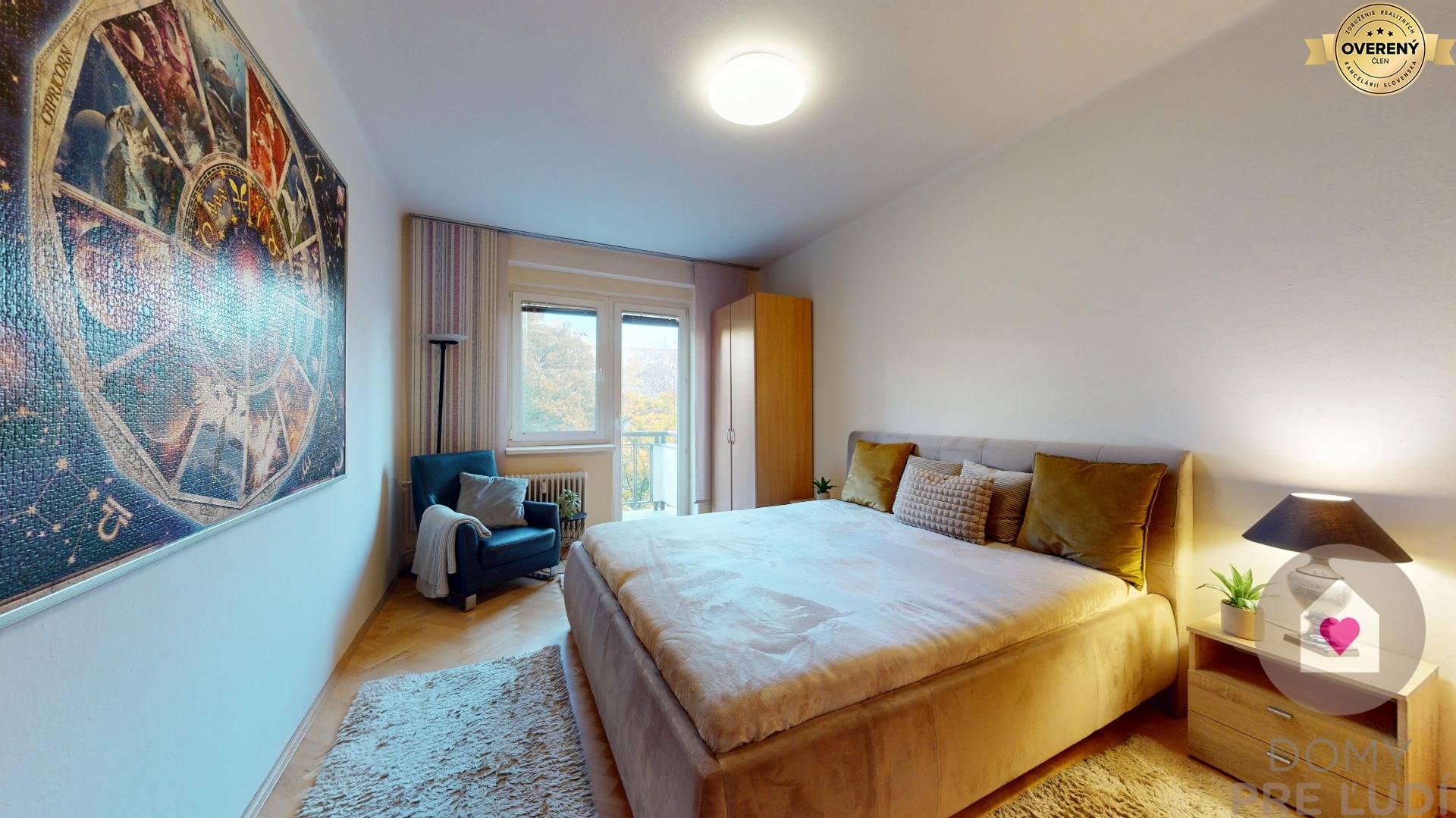 - priestrannou spálňou s manželskou posteľou s matracom, 2 x nočným stolíkom, kreslom, stojacou lampou a 3 šatníkovými skriňami. Vychádza sa z nej na balkón orientovaný do tichého vnútrobloku s množstvom zelene , ktorý zväčšuje plochu bytu o 4,2 m2,