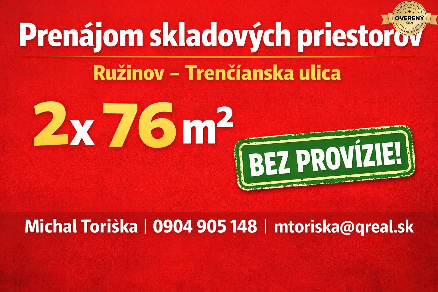 Samotná ponuka zahŕňa dva samostatné skladové celky po 76 m2 (spolu 152 m2), ktoré je možné prenajať aj jednotlivo. V kombinácii s uvedenou občianskou vybavenosťou a dostupnosťou MHD ide o riešenie, ktoré podporí efektívny každodenný chod skladu či menšej logistiky bez nárokov na zložitý presun za službami.