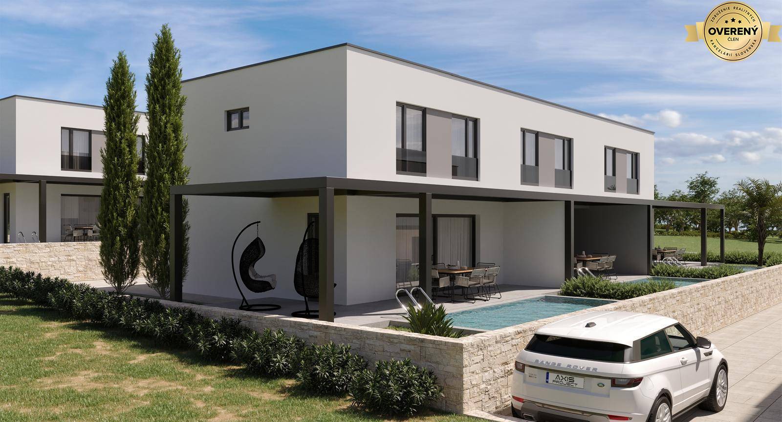 Výmera bočných apartmánov je 87,6 m2 + terasa (11 m2) s prístupom do záhradky (49 m2) s bazénom (19 m2).