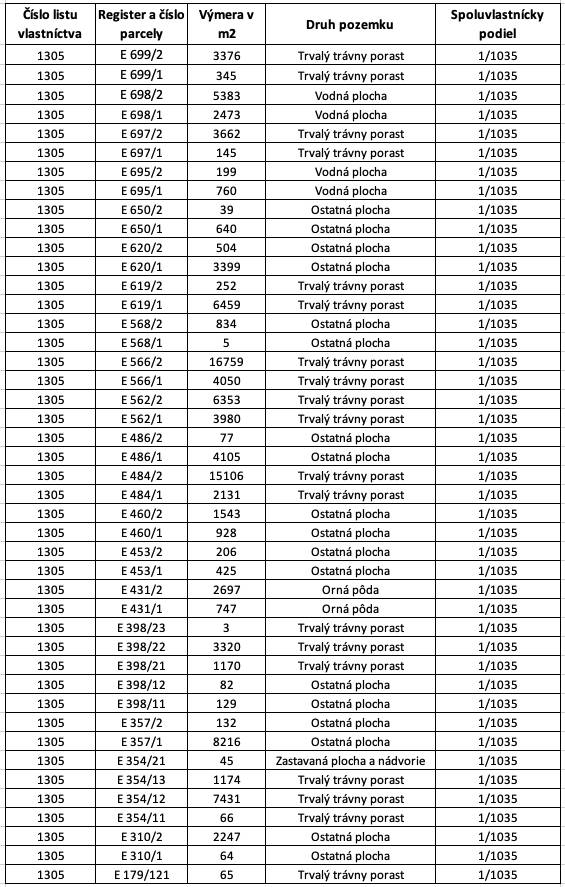 - Výmera spoluvlastníckych podielov tvorí celkom 1.601,68 m2, pričom pozemky sú evidované na liste vlastníctva č. 1305 pre katastrálne územie Dolné Kočkovce a vedené sú ako Trvalý trávny porast, Lesný pozemok, Ostatná plocha, Vodná plocha a Zastavaná plocha a nádvorie.