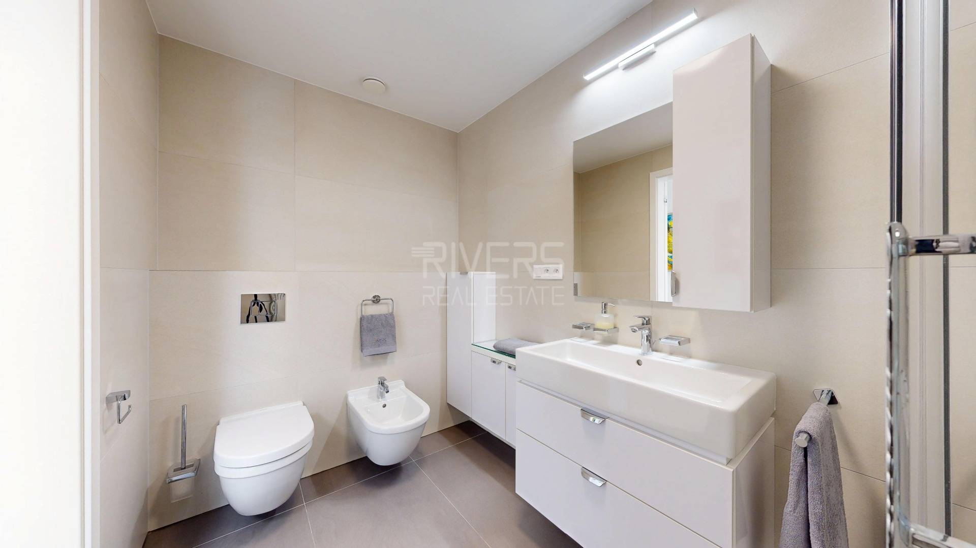 • drevené podlahy, bezfalcové dvere, kúpeľňa s kvalitnými zriaďovacími predmetmi s obkladmi – nadštandardné prevedenie od developera, kvalitná kuchyňa s vyššou triedou spotrebičov značky Miele a žulovou pracovnou doskou s podsvietením