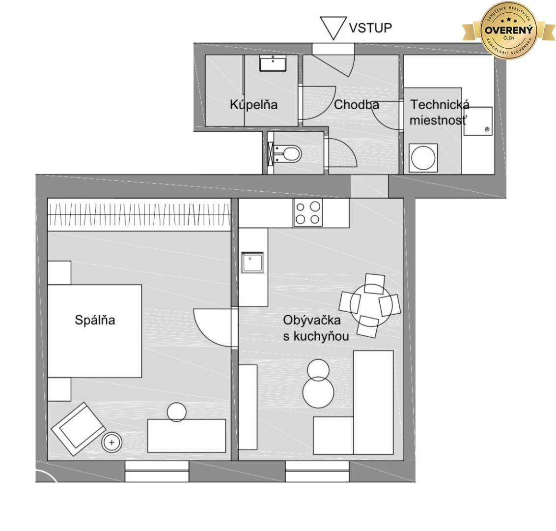 Dispozícia: vstupná chodba, kúpeľna so sprchovacím kútom, samostatná toaleta s oknom do vetracej šachty, technická miestnosť s úložným priestorom, práčkou a plynovým kotlom s integrovaným nzásobníkom TÚV, obývacia izba s kuchynským kútom a spálňa.