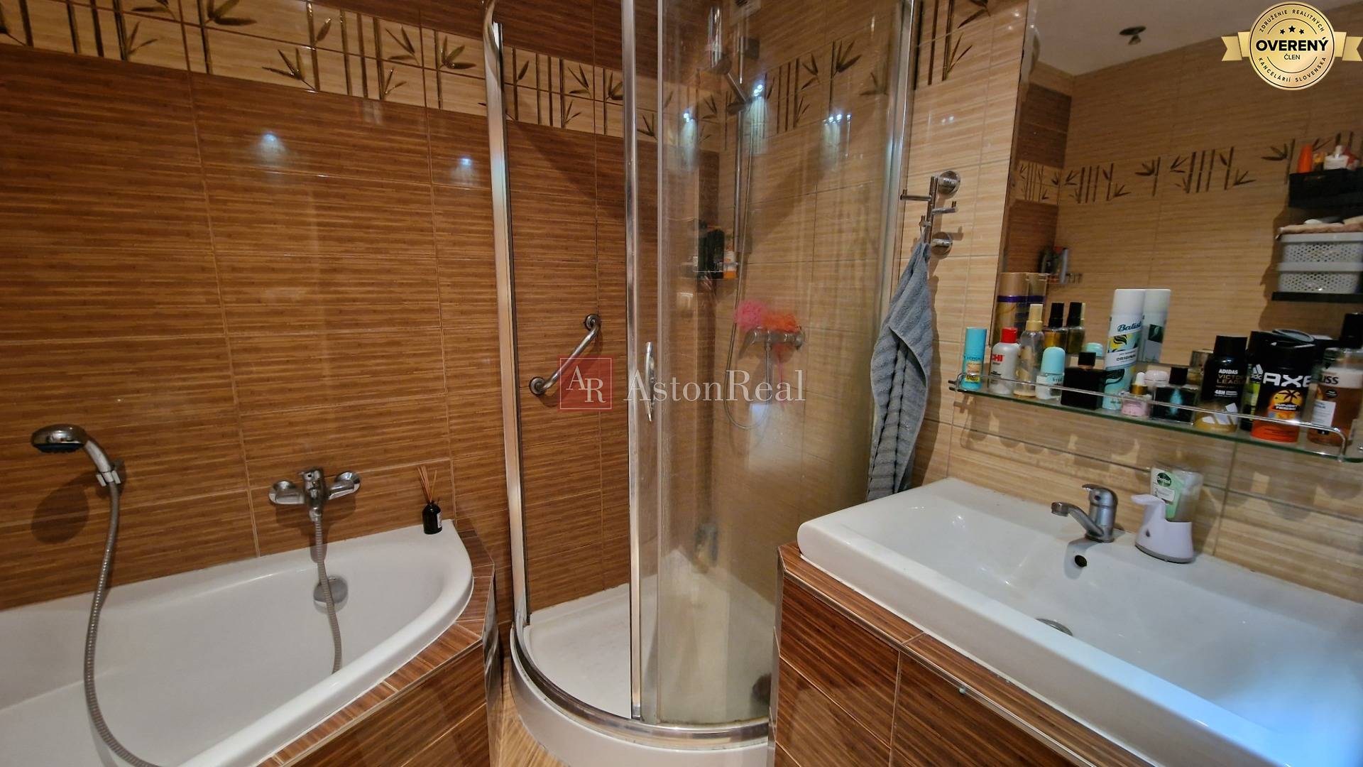 kúpeľňa s rohovou vaňou aj samostatným sprchovacím kútom,