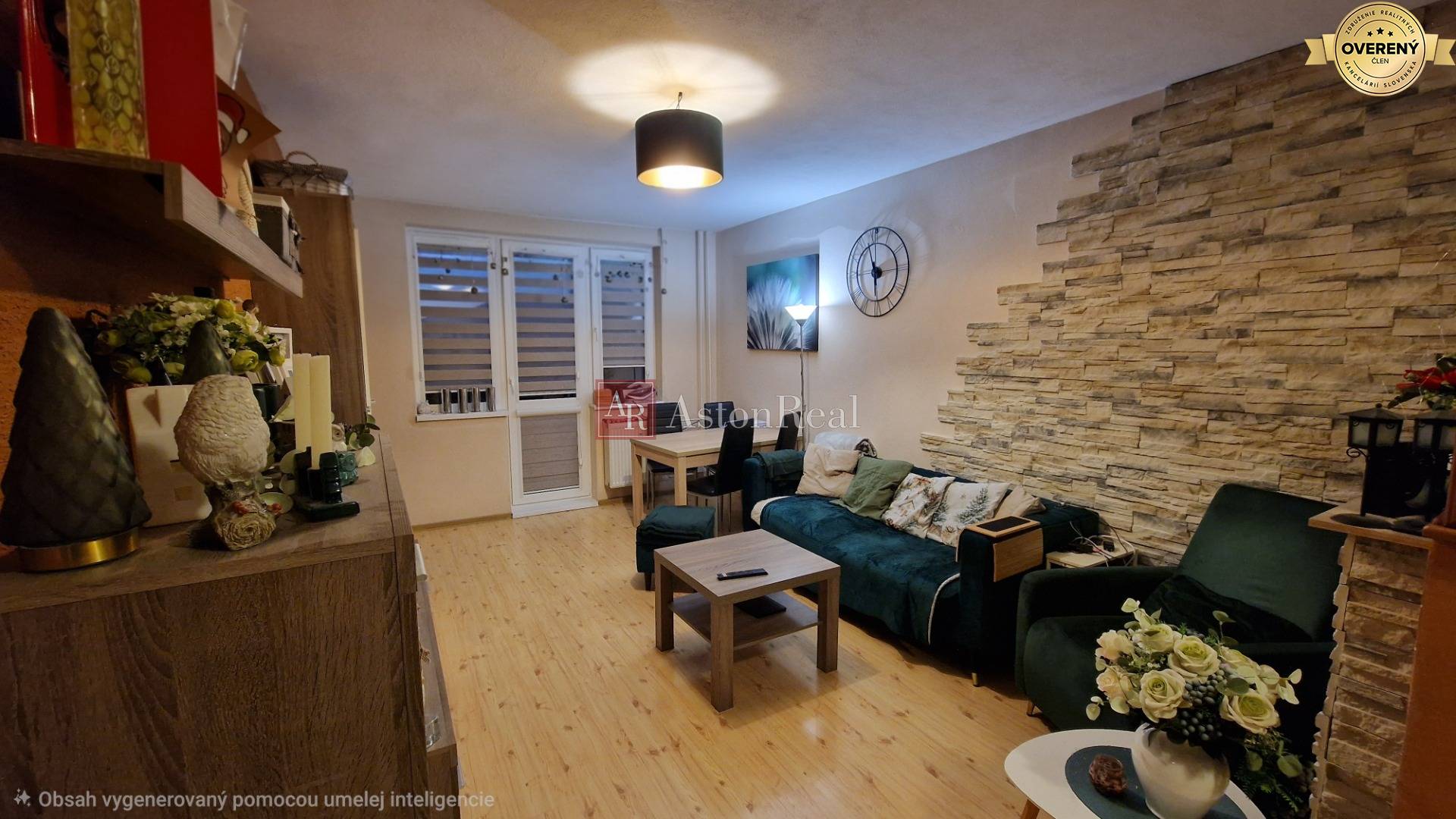 priestranná obývacia izba s bioalkoholovým krbom a vstupom na väčší balkón,