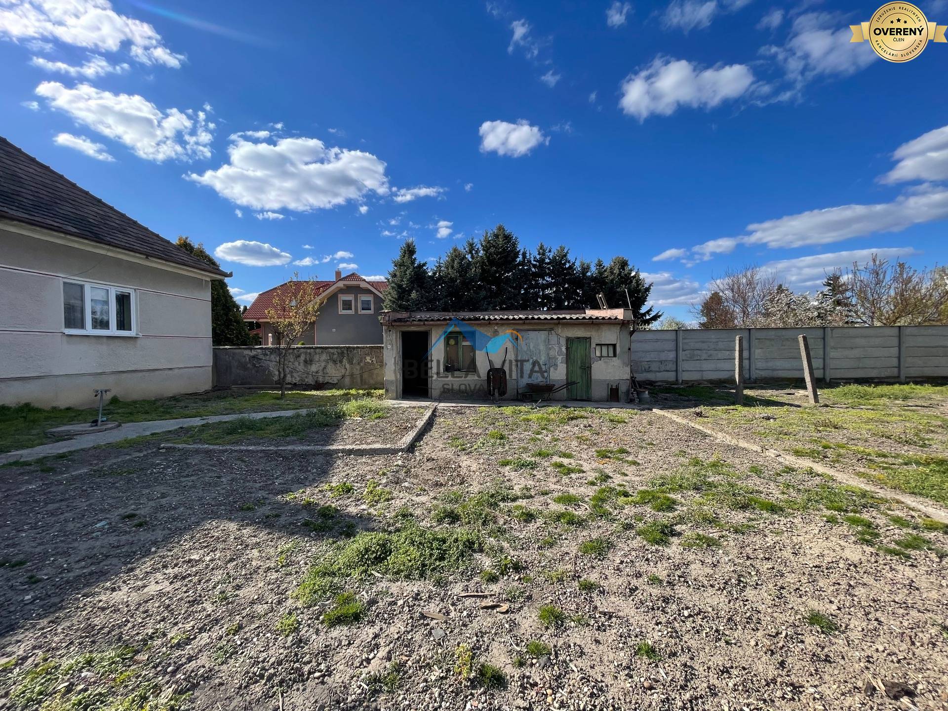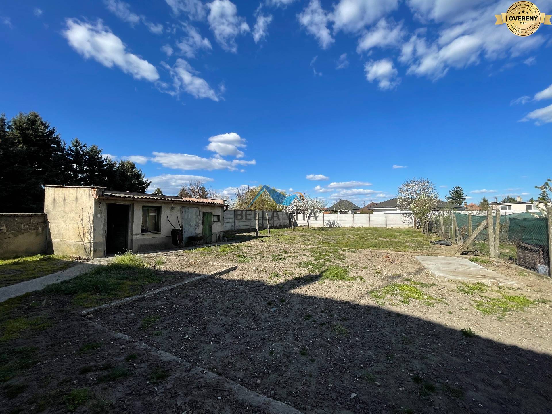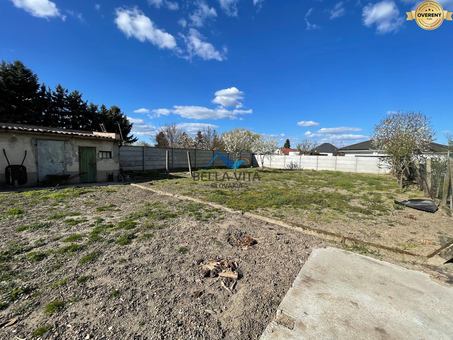 Pozemok s rozlohou 828 m2 je rovinný a ponúka dostatok priestoru pre záhradu, kde už rastie niekoľko ovocných stromov. Na pozemku sa nachádza aj menšia stavba, ktorá si vyžaduje renováciu, no môže poslúžiť ako dielňa alebo sklad.