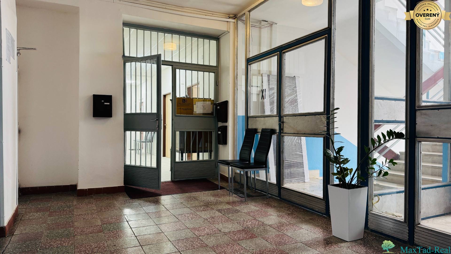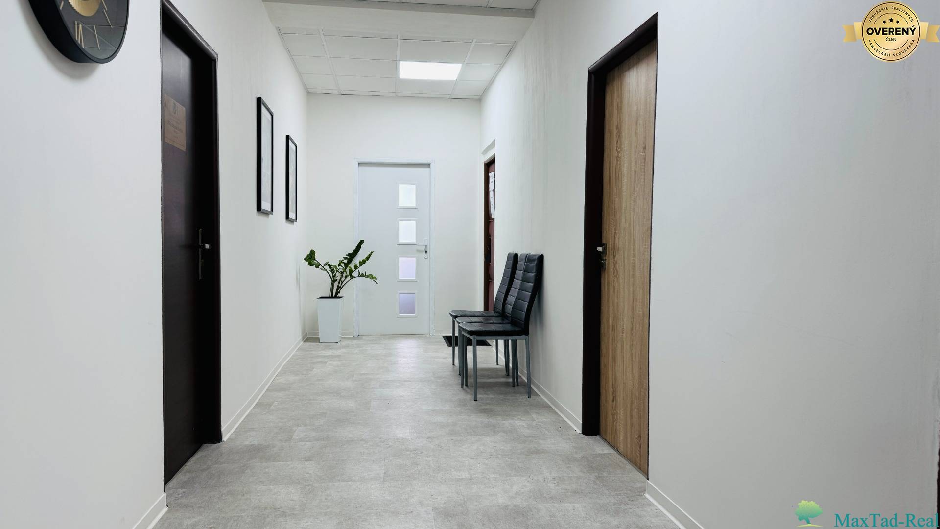 Spoločné priestory sú po rekonštrukcii – čistá, útulná chodba s možnosťou sedenia, ideálna pre klientov počas čakania. Na poschodí sa nachádzajú samostatné pánske a dámske WC, doplnené o sprchu a umývadlo, čo zvyšuje komfort každodenného využívania.