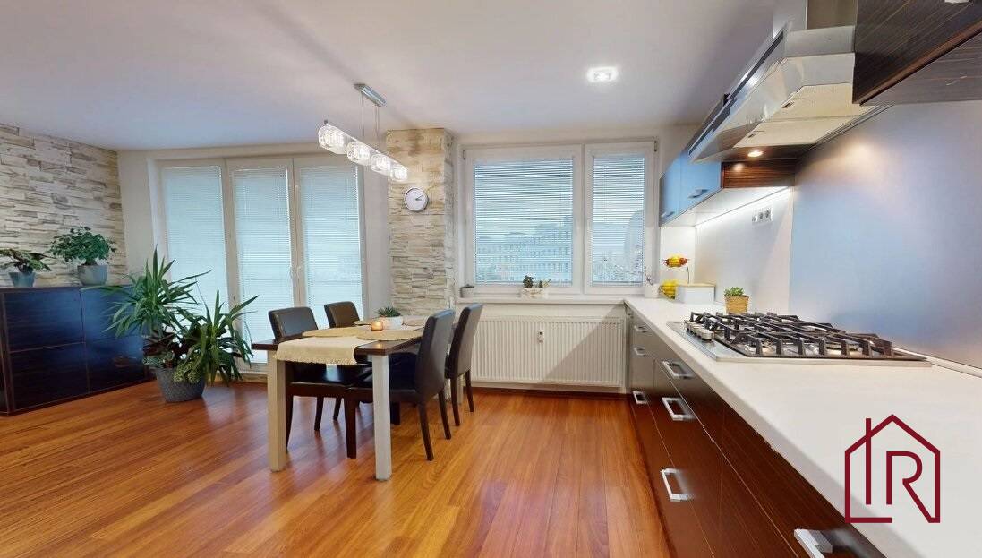 Interiér bytu prešiel kvalitnou rekonštrukciou – moderné materiály, funkčné riešenia a otvorená denná časť vytvárajú príjemný pocit veľkorysého priestoru. Obývacia izba prepojená s kuchyňou je dominantou bytu a vďaka francúzskym oknám je krásne presvetlená po celý deň. Bio-krb dodáva miestnosti atmosféru, ktorú si okamžite zamilujete.