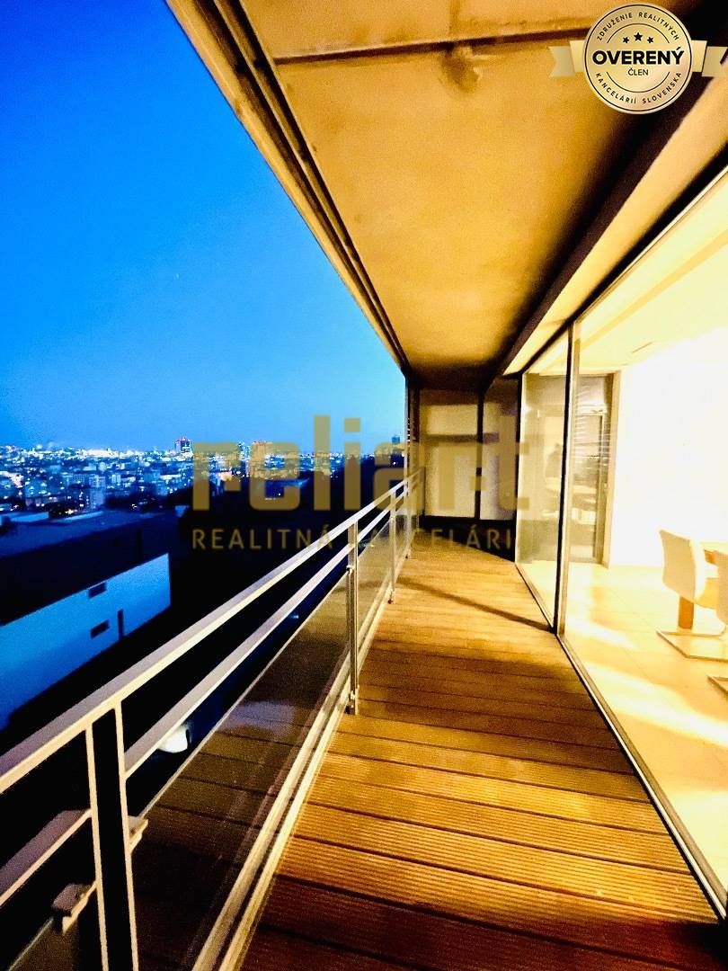 Ponúkame na prenájom luxusný, slnečný 4-izbový byt s terasou sa nachádza v projekte "Minergo" na Zlatej nohe vo vyhľadávanej lokalite na Kolibe. Byt veľmi dobre dispozične riešený s panoramatickým výhľadom na mesto. Byt o rozlohe 165m2 pozostáva z centrálnej chodby, veľkého obývacieho priestoru, kde sa nachádza plne vybavená kuchyňa a jedáleň, 3 spální, šatníka, komory a dvoch kúpeľní s vaňou i sprchového kútu. Z obývačky je prístup na terasu orientovanú na juhovýchod. má stenu celú presklennú, čo umožňuje nádherný pohľad na mesto pri zachovaní súkromia. Tento byt sa prenajíma zariadený a ku zariadeniu bytu patria, kuchynské spotrebiče, práčka, vstavané skrine, LCD TV, hliníkové okná a mnoho ďalšieho. K bytu prislúcha pivnica a 2 parkovacie státia v podzemnej garáži (jedno miesto je v cene a druhé je možné prenajať . Obyvatelia tohto objektu majú možnosť využívať vnútorný bazén, saunu a terasu, ktorá je pri bazéne. Objekt sa nachádza v uzatvorenom oplotenom areáli v tichej lokalite s množstvom upravenej zelene, ponúka rýchly prístup do centra mesta a splní očakávania náročného záujemcu.