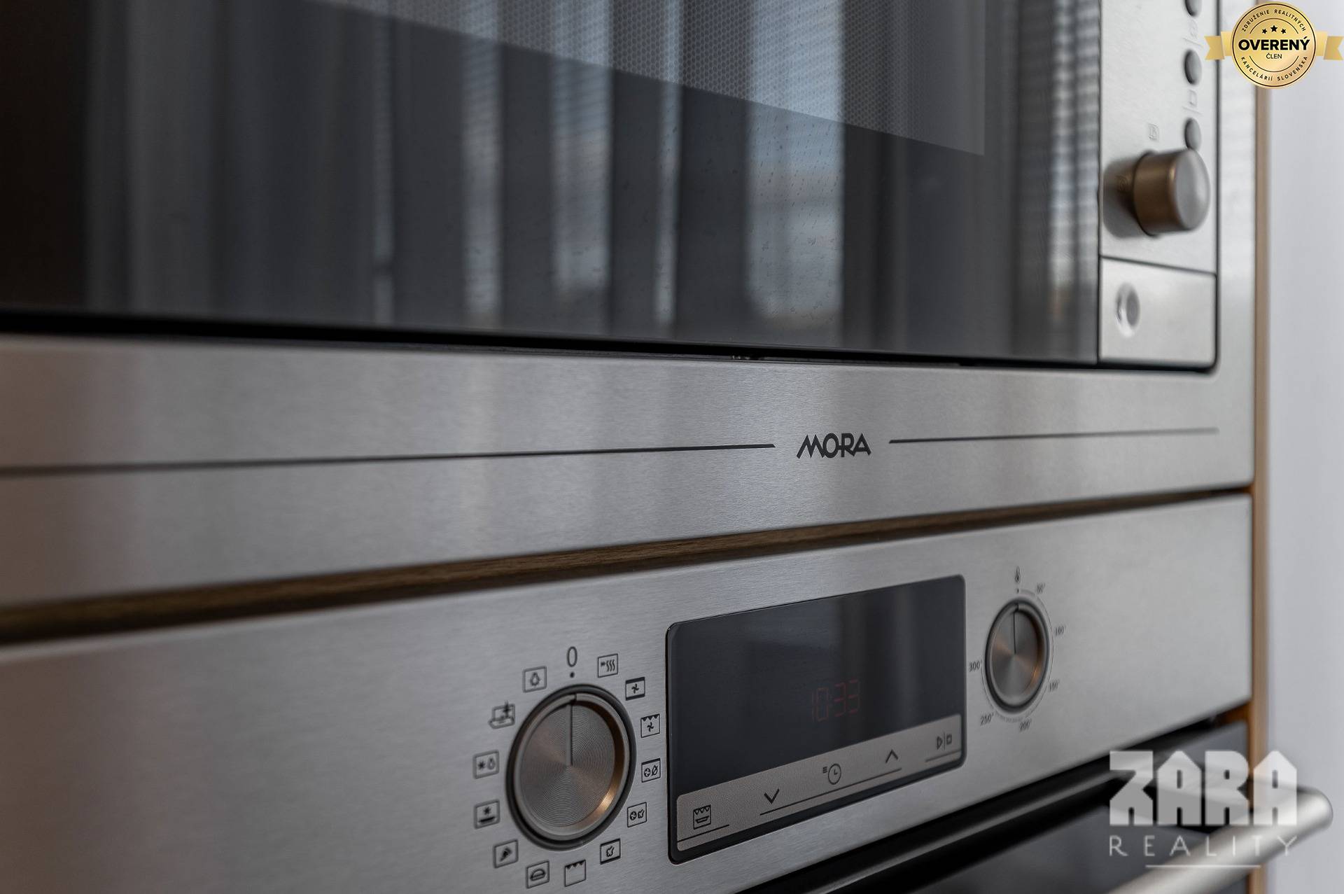 Zabudované vstavané spotrebiče MORA: zabudovaná chladnička s mrazničkou • mikrovlnná rúra • väčšia umývačka riadu • indukčná varná doska • teplovzdušná rúra • zabudovaný digestor • granitové umývadlo. Orientácia na východ.