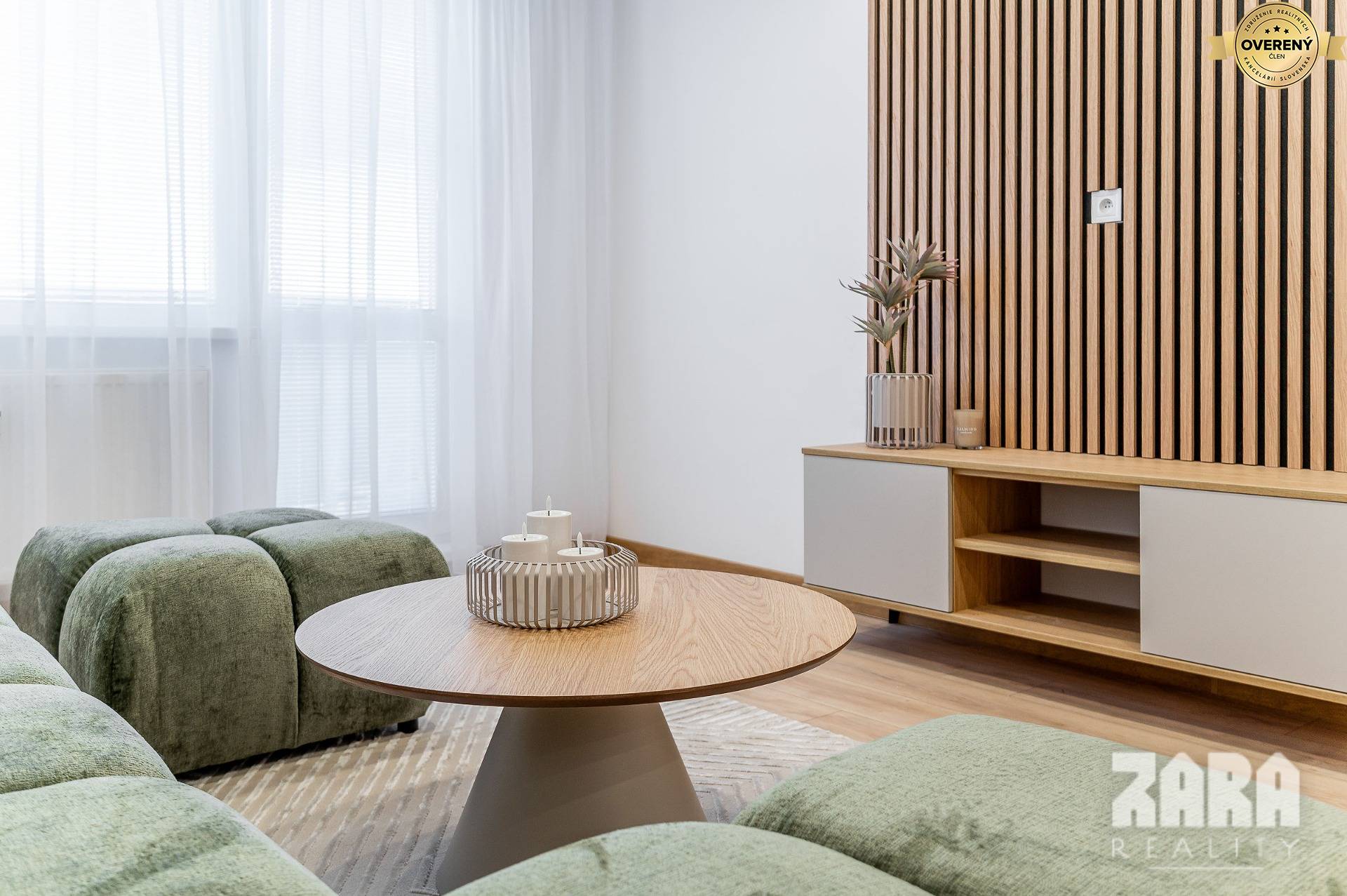 rozťahovací gauč, konferenčný stolík, koberec, skrinka pod televízorom, dekoratívna stena s lamelami.