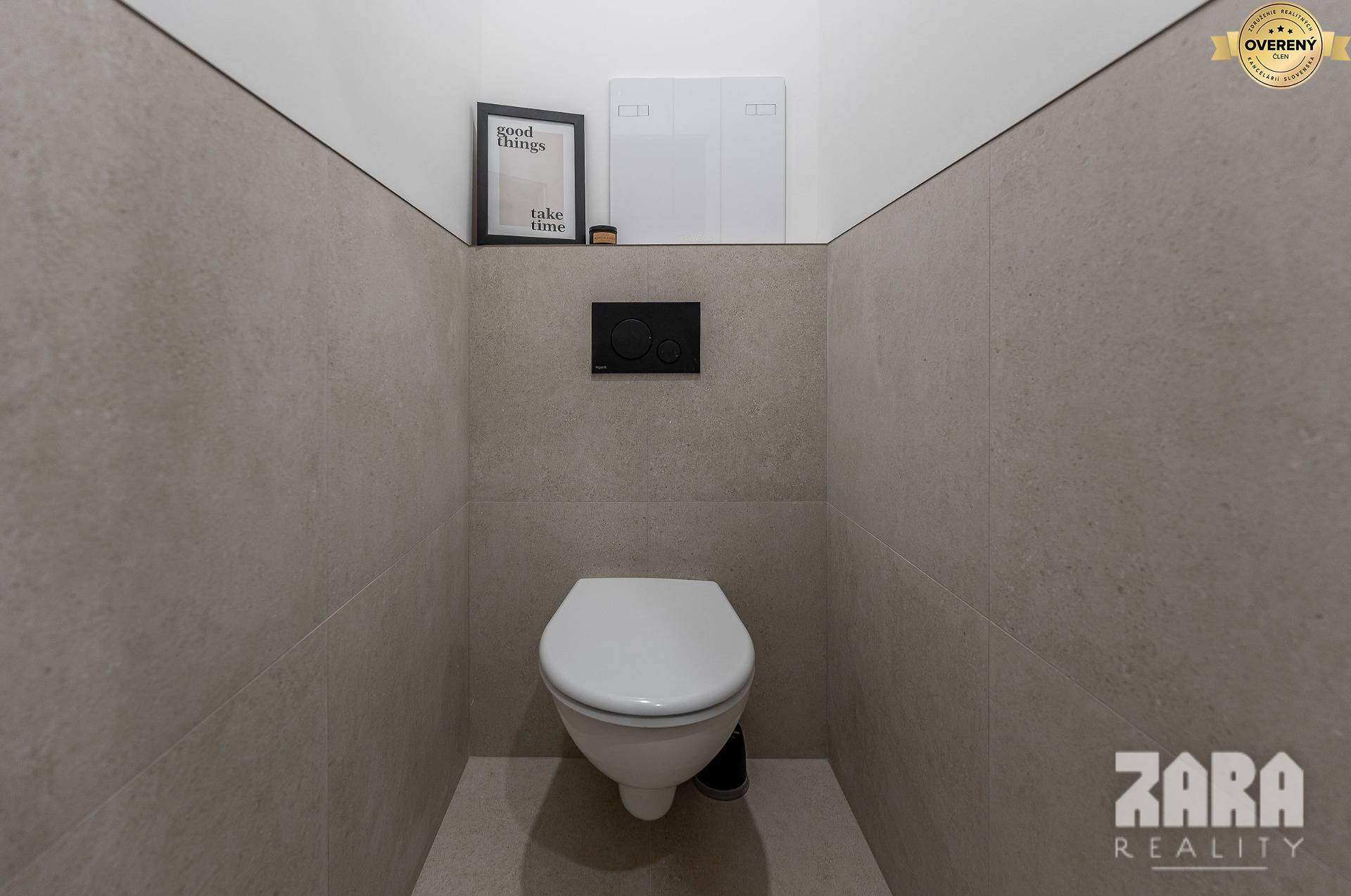 Toaleta je oddelená, závesná, so samostatným vstupom. Keramický obklad a dlažba farebne zladená s kúpeľňou. Odsávanie, menené stupačky.