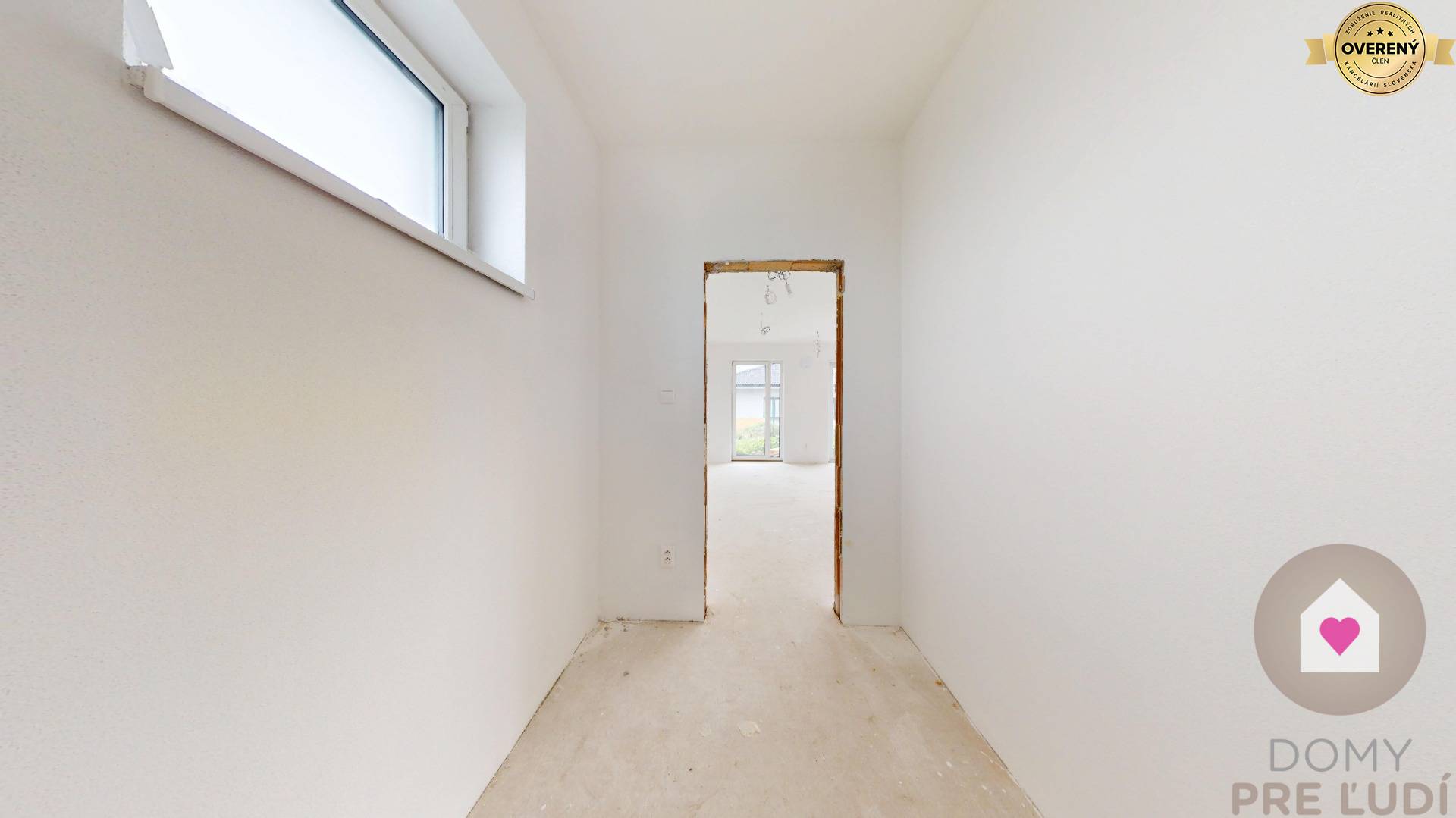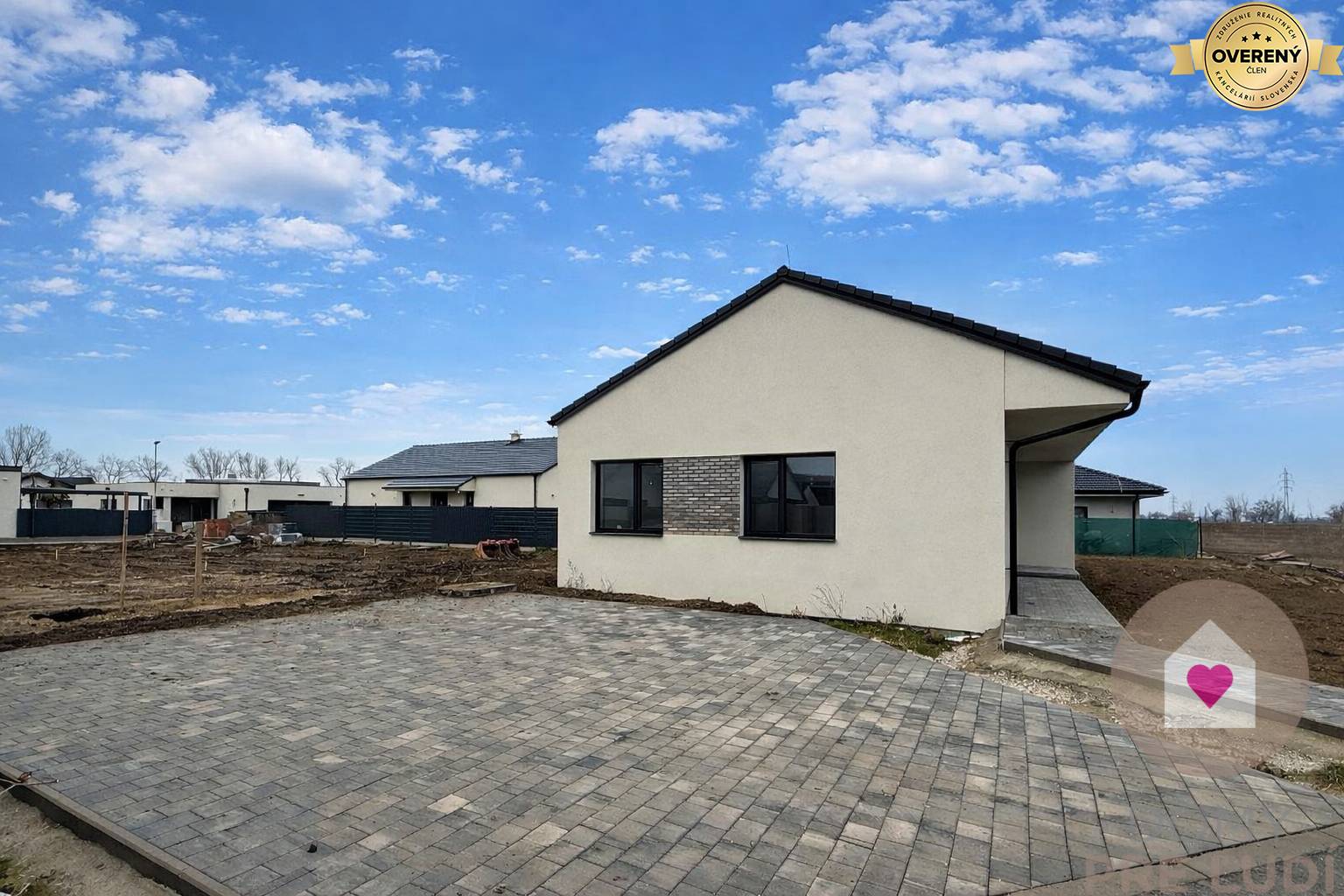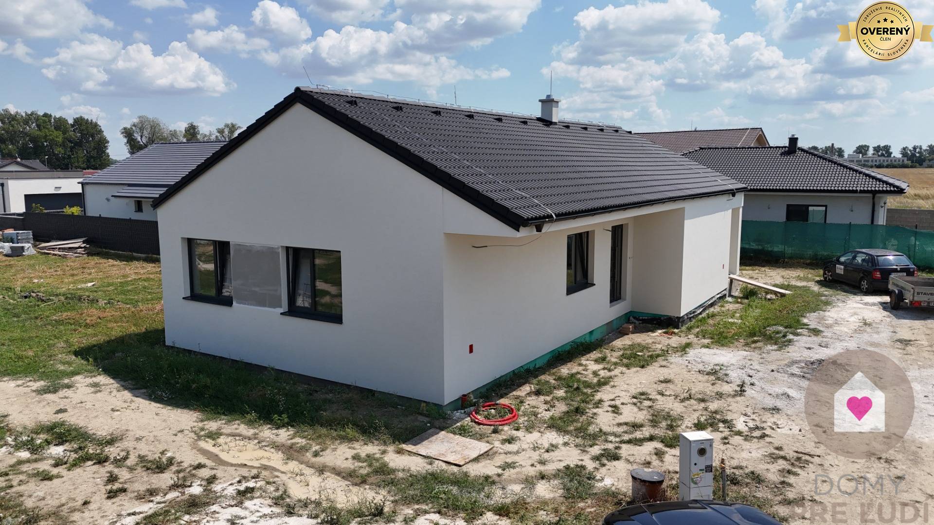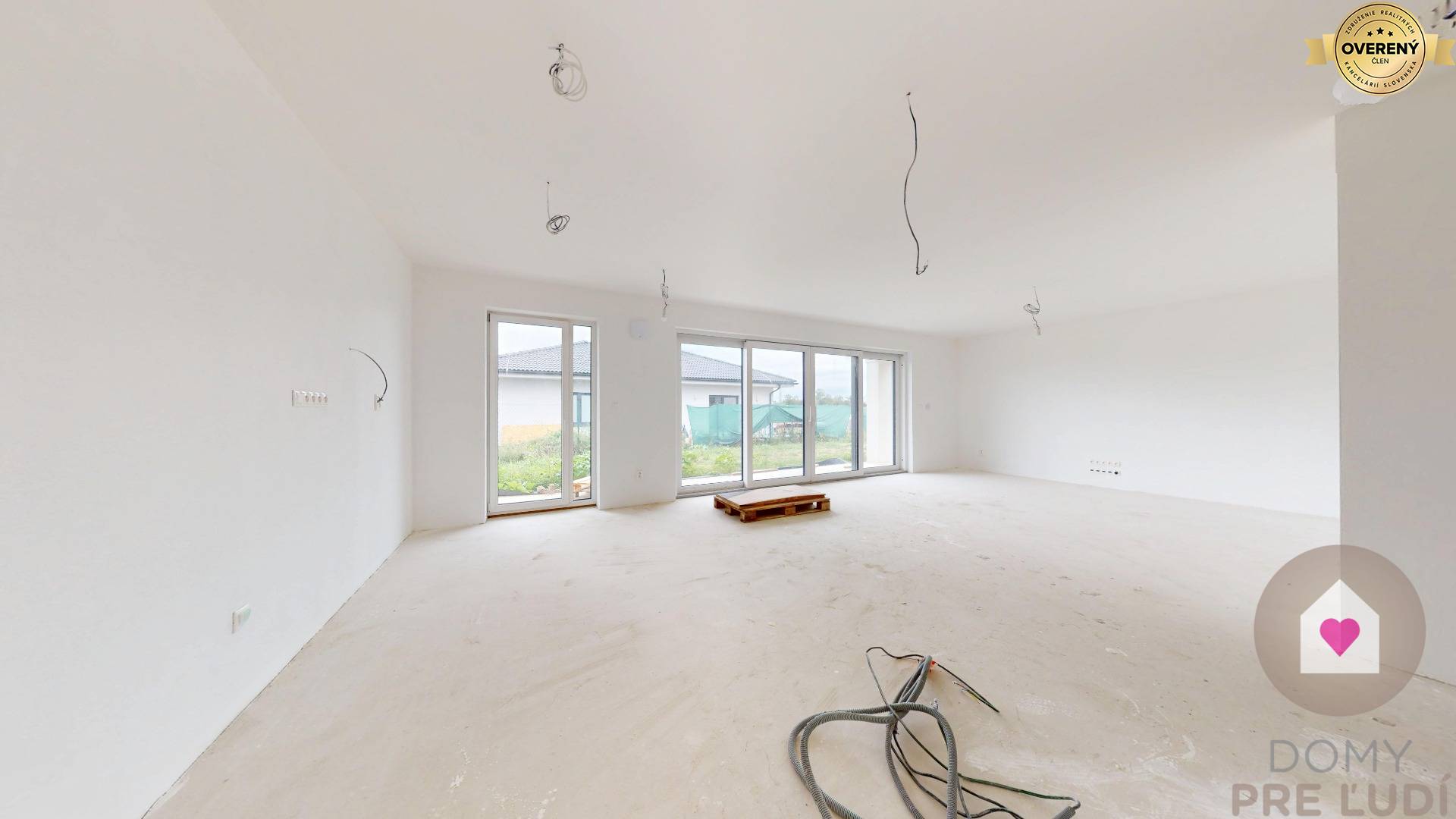 Okná a vchodové dvere sú plastové, trojsklo značky SALAMANDER, z exteriéru laminované v modernom odtieni antracit. V interiéri sú pripravené podlahy pre pokládku dlažieb alebo plávajúcich podláh, urobené sú kompletné rozvody elektriny vrátane vypínačov a zásuviek, dátové rozvody podľa projektu s možnosťou ďalšieho rozšírenia. Dom má elektrické podlahové kúrenie, zásobník na teplú vodu, kompletné rozvody vody a predprípravu na krb. Samozrejmosťou je napojenie na všetky inžinierske siete – vodu, elektrinu a kanalizáciu. Pozemok okolo domu je vyrovnaný s chodníkom, terasou a parkovacími státiami. Kúpeľňa dokončená do štandardu.