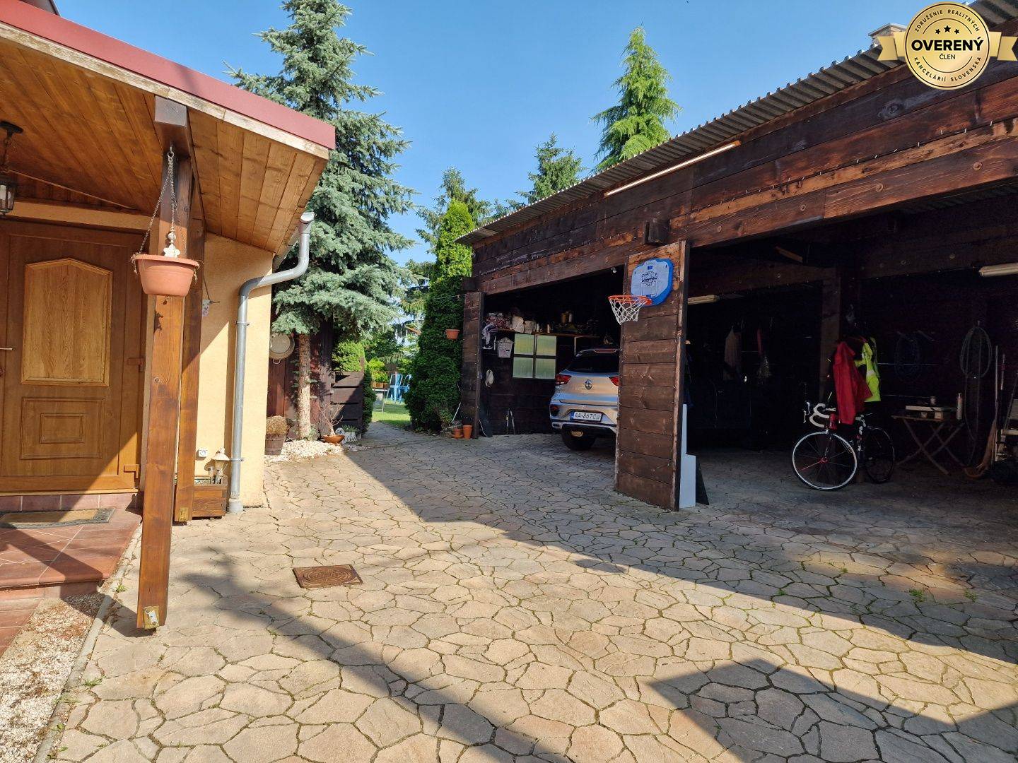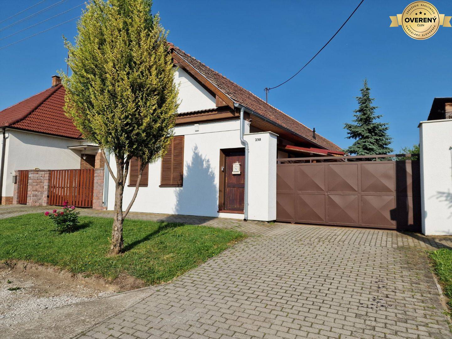 Elektrická brána s diaľkovým ovládaním, zámková dlažba, rovinatý pozemok s udržiavaným trávnym porastom.