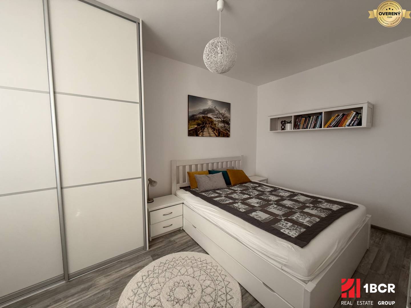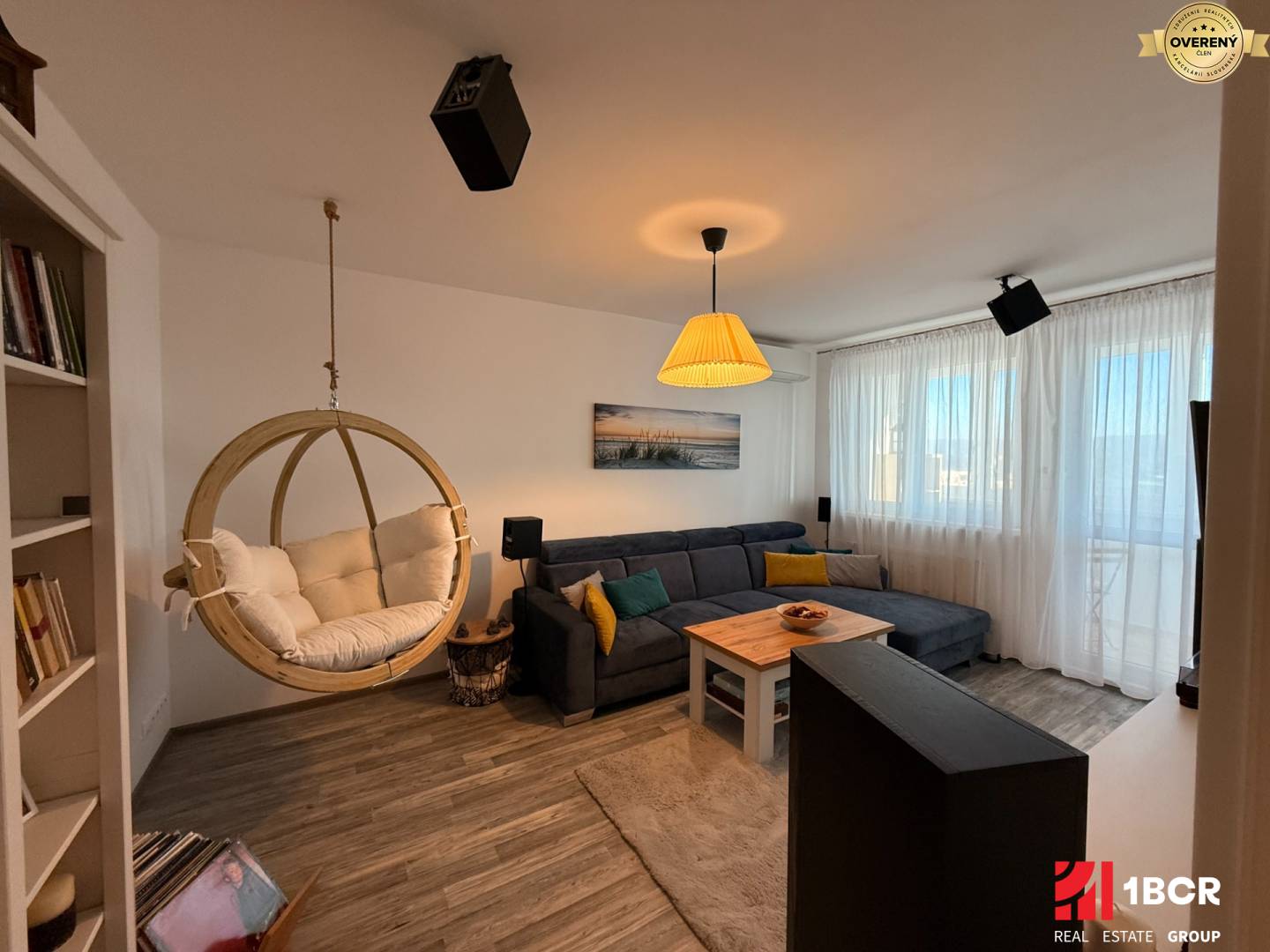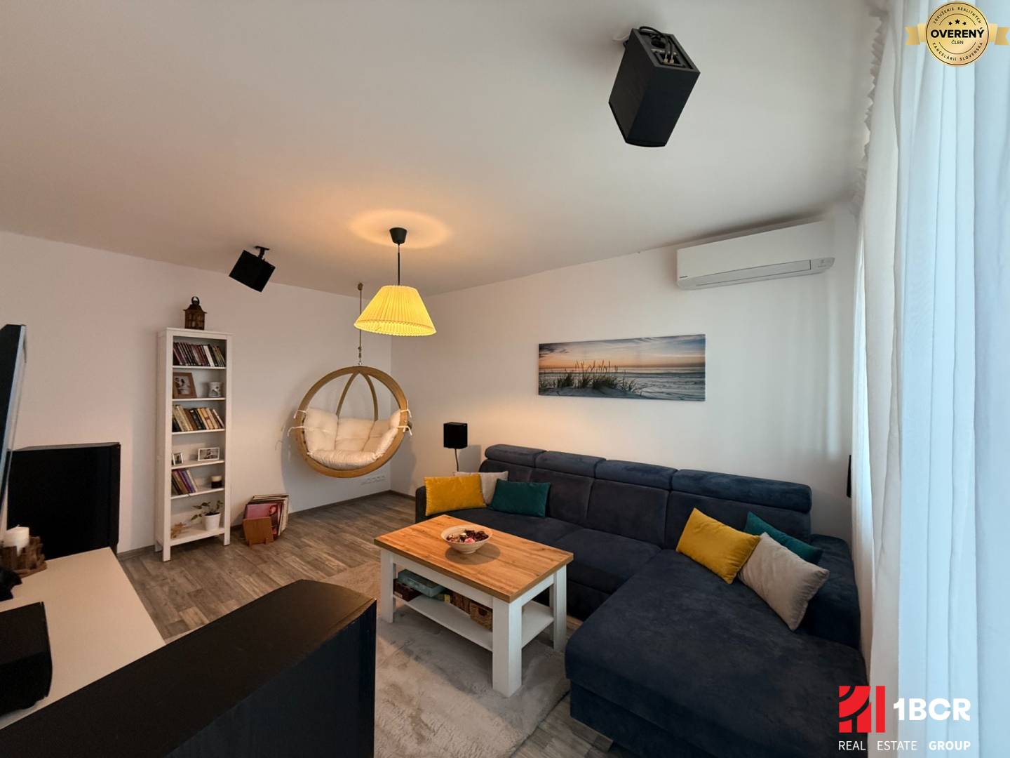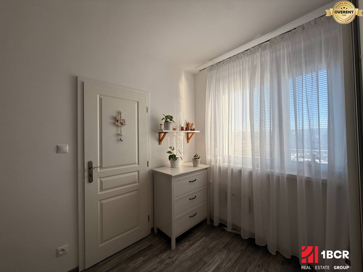 Samotný byt je premyslene riešený tak, aby poskytoval maximálne pohodlie a veľmi príjemnú atmosféru. Úvodom vás privíta priestranná chodba vybavená elegantnou presklenou roldor skriňou s dostatkom úložného priestoru. Súčasťou vstupnej časti je aj samostatné WC a kúpeľňa so sprchovým kútom. Po ľavej strane sa nachádza hosťovská izba, ktorá môže slúžiť ako pracovňa či detská izba. Disponuje vstavanou skriňou a pôsobí svetlo a vzdušne. Srdcom bytu je krásna obývacia izba s veľkou rohovou sedačkou a štýlovým zaveseným húpacím kreslom, ktoré dotvára útulnú a relaxačnú atmosféru. Priestor je ladený v jemných farbách a vďaka veľkému oknu pôsobí svetlo a veľmi harmonicky. Komfort bývania zvyšuje aj klimatizácia, ktorá spríjemní letné dni. Z obývačky je priamy vstup na lodžiu s pokojným výhľadom, ktorá poskytuje ideálne miesto na rannú kávu či večerný oddych. Z obývacej izby sa vstupuje do kuchyne, ktorá je ladená do nadčasových bielych farieb a pôsobí veľmi elegantne a vzdušne. Ponúka množstvo úložného priestoru, vstavané spotrebiče a praktickú pracovnú plochu. Pri oknách sa nachádza jedálenské sedenie, ktoré vďaka prirodzenému dennému svetlu vytvára mimoriadne príjemný priestor na stolovanie. Z kuchyne je zároveň priamy vstup do hlavnej spálne. Tá pôsobí pokojne, čisto a harmonicky. Je vybavená veľkou posteľou a vstavanou skriňou, ktorá poskytuje dostatok úložného priestoru. Celý byt pôsobí veľmi útulne, svetlo a ponúka premyslené dispozičné riešenie, ktoré zvyšuje komfort bývania.