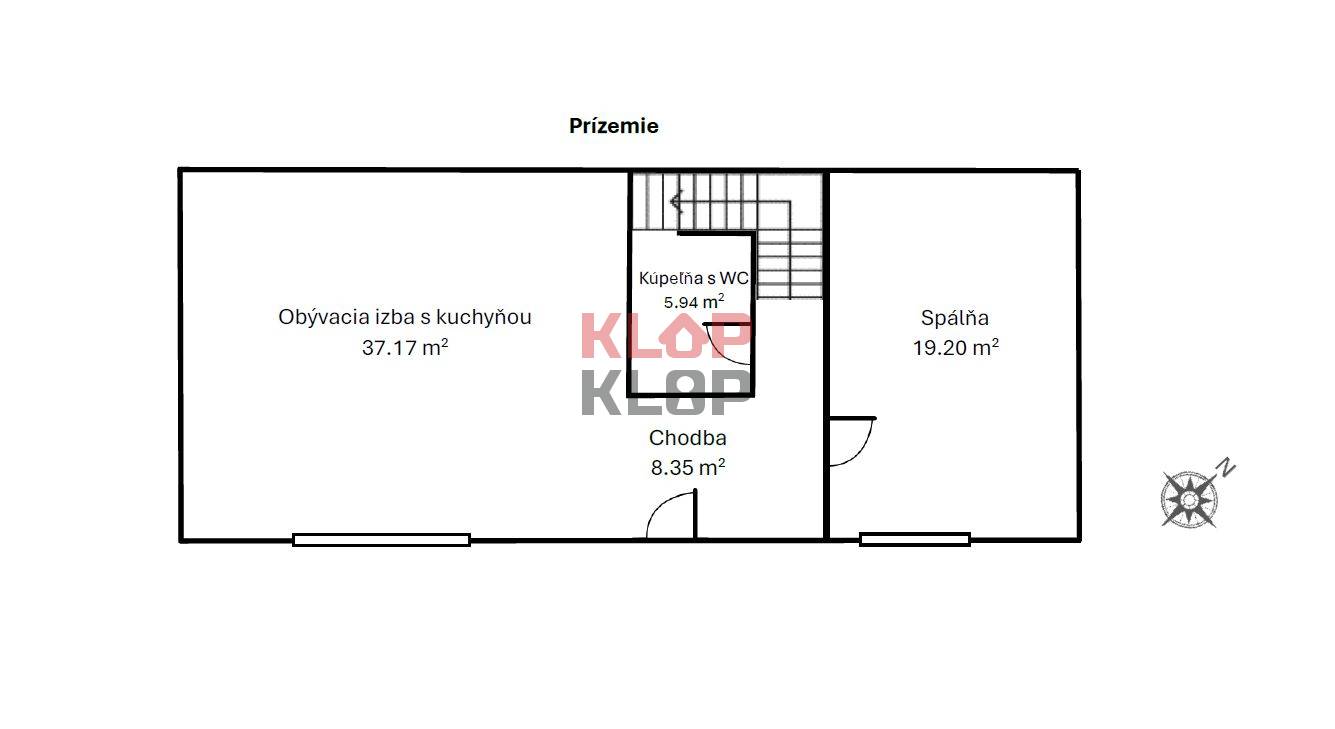 prízemie: vstupná hala, obývacia izba s kuchyňou, 1x samostatná spálňa, 1x kúpeľňa s WC