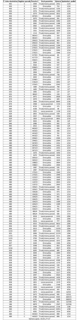 – Výmera spoluvlastníckych podielov tvorí celkom 14.011,77 m2, pričom pozemky sú na listoch vlastníctva vedené ako Trvalý trávny porast, Orná pôda a Lesný pozemok.