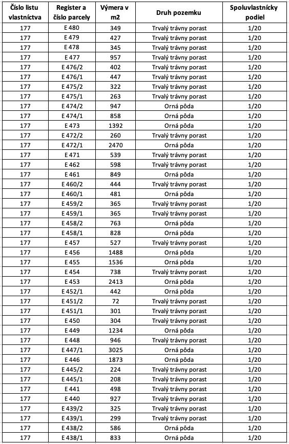 - Výmera spoluvlastníckych podielov tvorí spolu 3.853,93 m2 a pozemky sú na listoch vlastníctva vedené ako Orná pôda a Trvalý trávny porast.