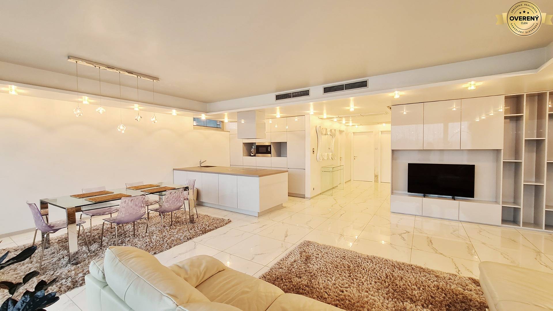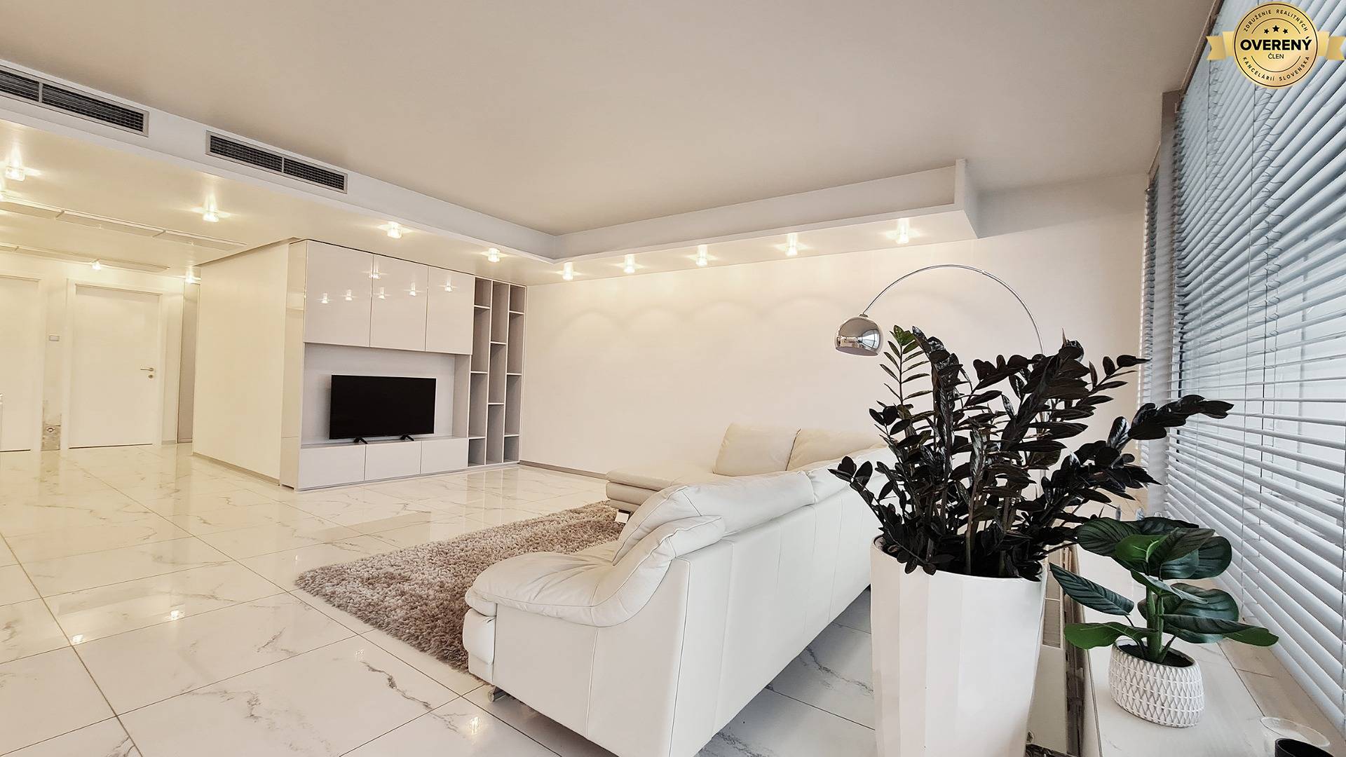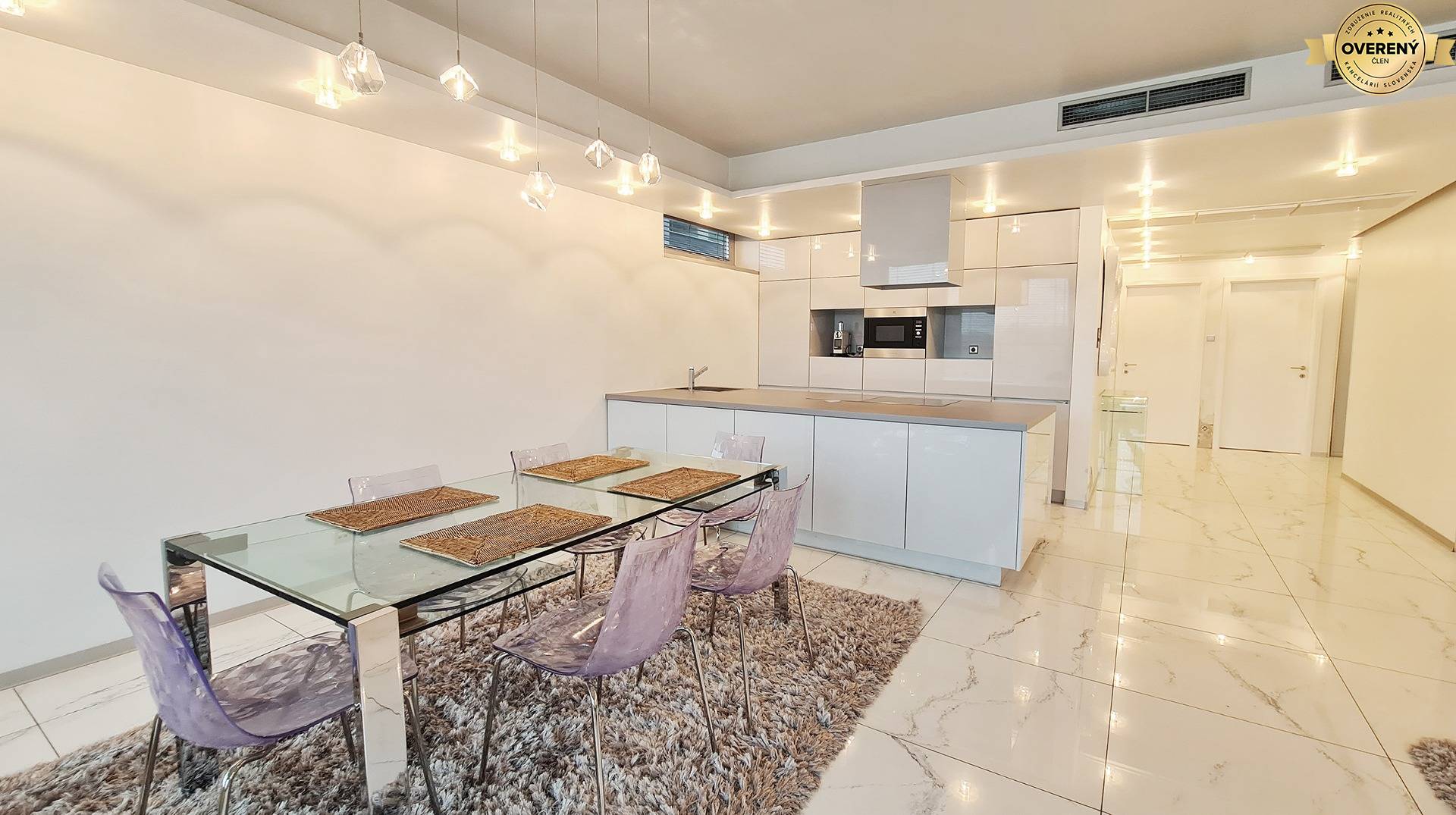 Byt je moderne a vkusne zariadený, vybavený kvalitnými materiálmi a technológiami na vysokej úrovni, ktoré zabezpečujú maximálny komfort každodenného bývania. Veľkoformátové presklenia prinášajú do interiéru dostatok prirodzeného svetla a umocňujú výnimočný charakter priestoru.