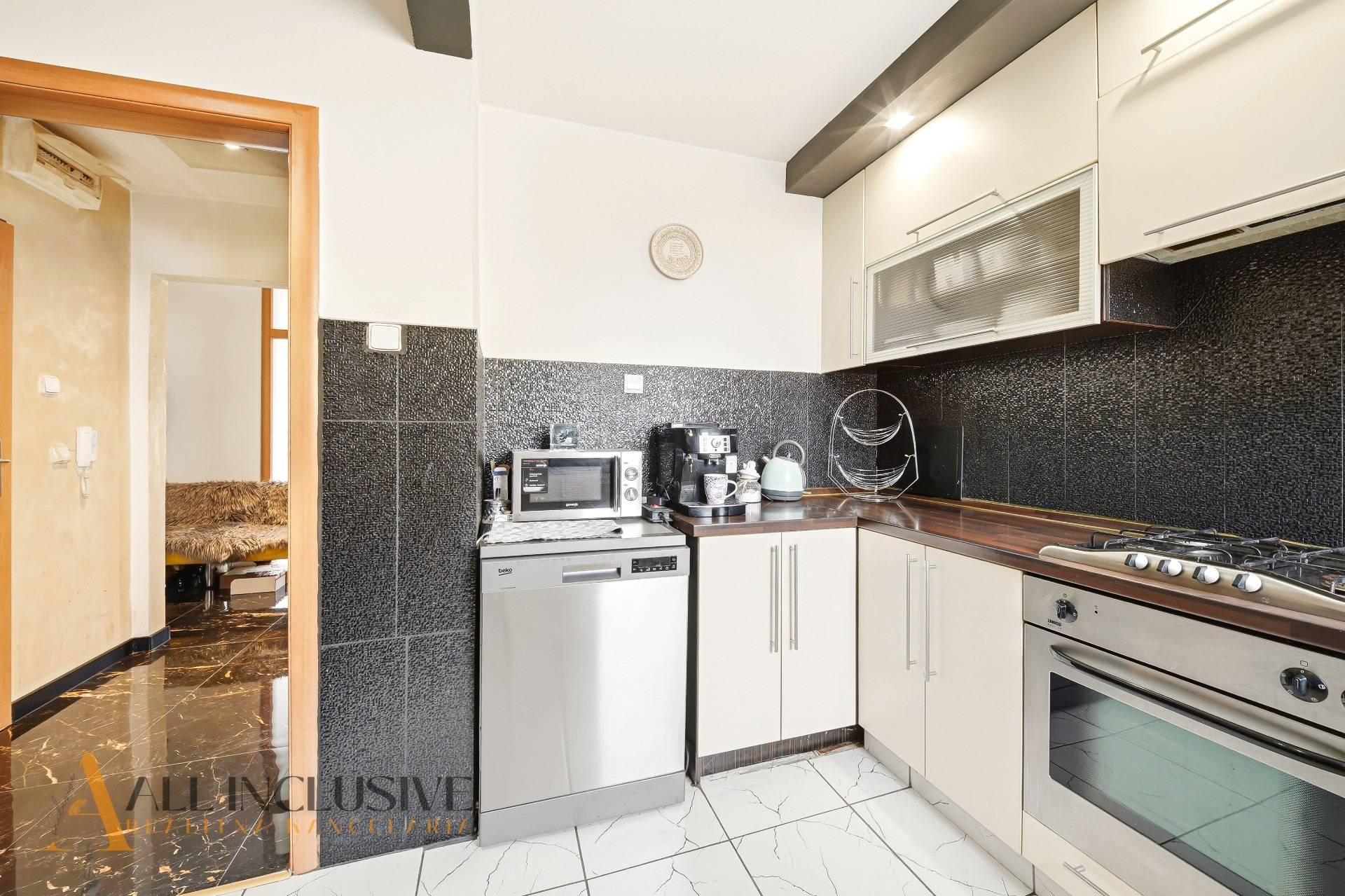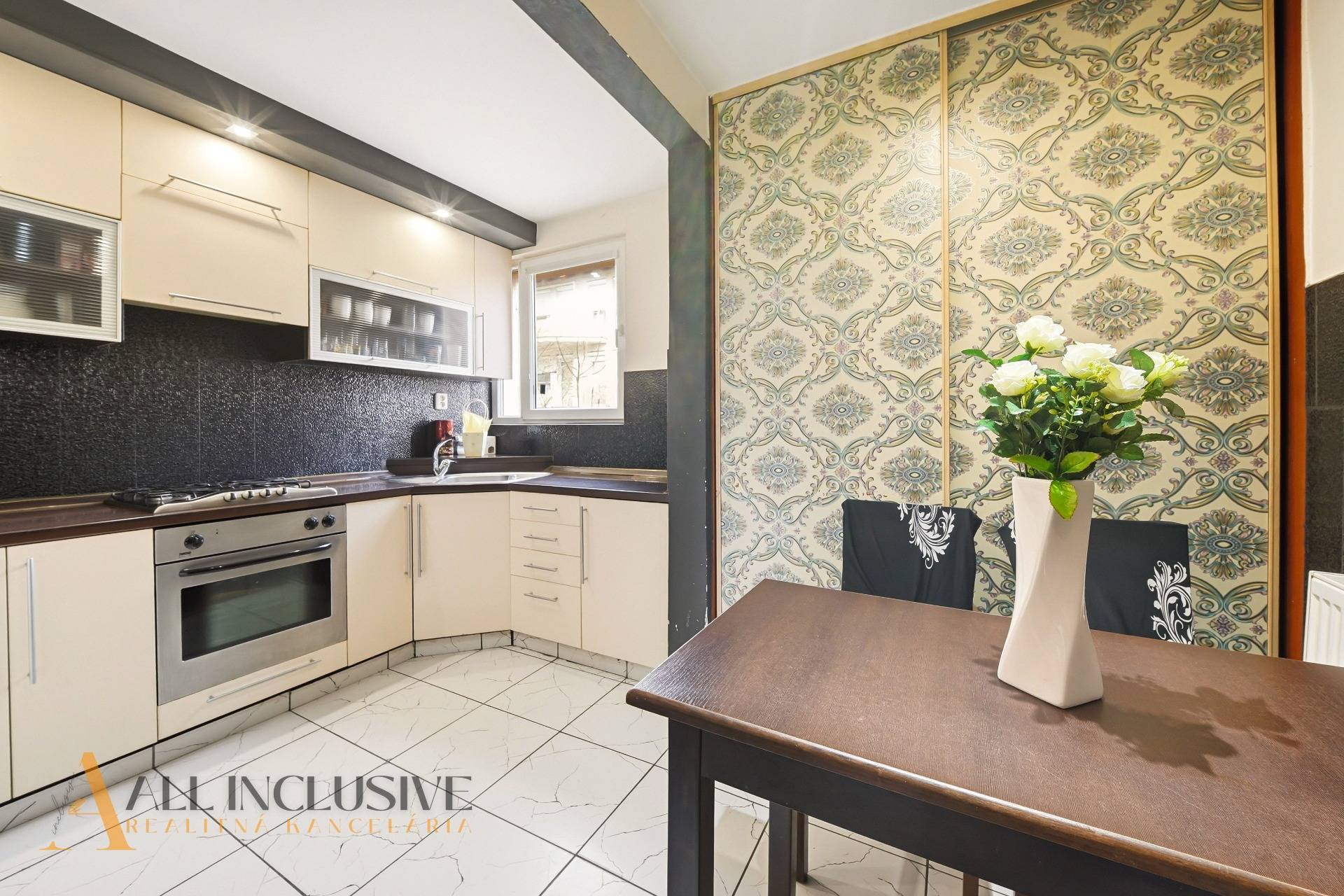 Kuchyňa je prakticky riešená, vybavená umývačkou riadu a plynovým sporákom, pričom ponúka dostatok úložného priestoru. Atypický a vkusne zvolený obklad v kuchyni a kúpeľni dodáva interiéru jedinečný charakter.