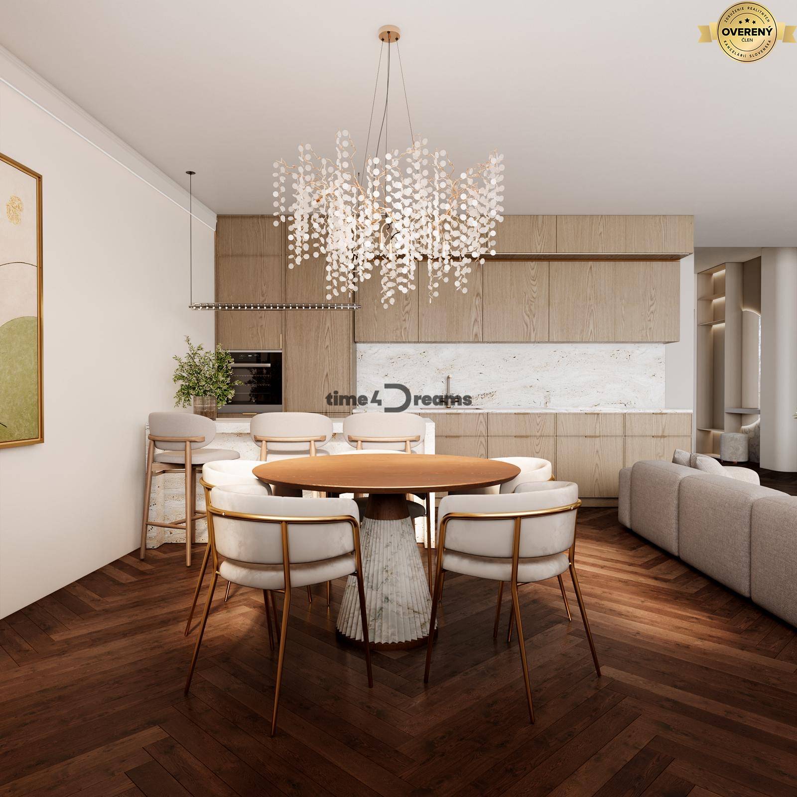 - Denná časť bytu sa nachádza na spodnom podlaží mezonetu, kde vysoké stropy a veľké presklené plochy vytvárajú vzdušný a svetlom zaplavený priestor. Táto časť bytu je prirodzeným centrom života – miestom pre spoločné chvíle, stretnutia či pokojné večery v jedinečnej atmosfére mestského bývania.