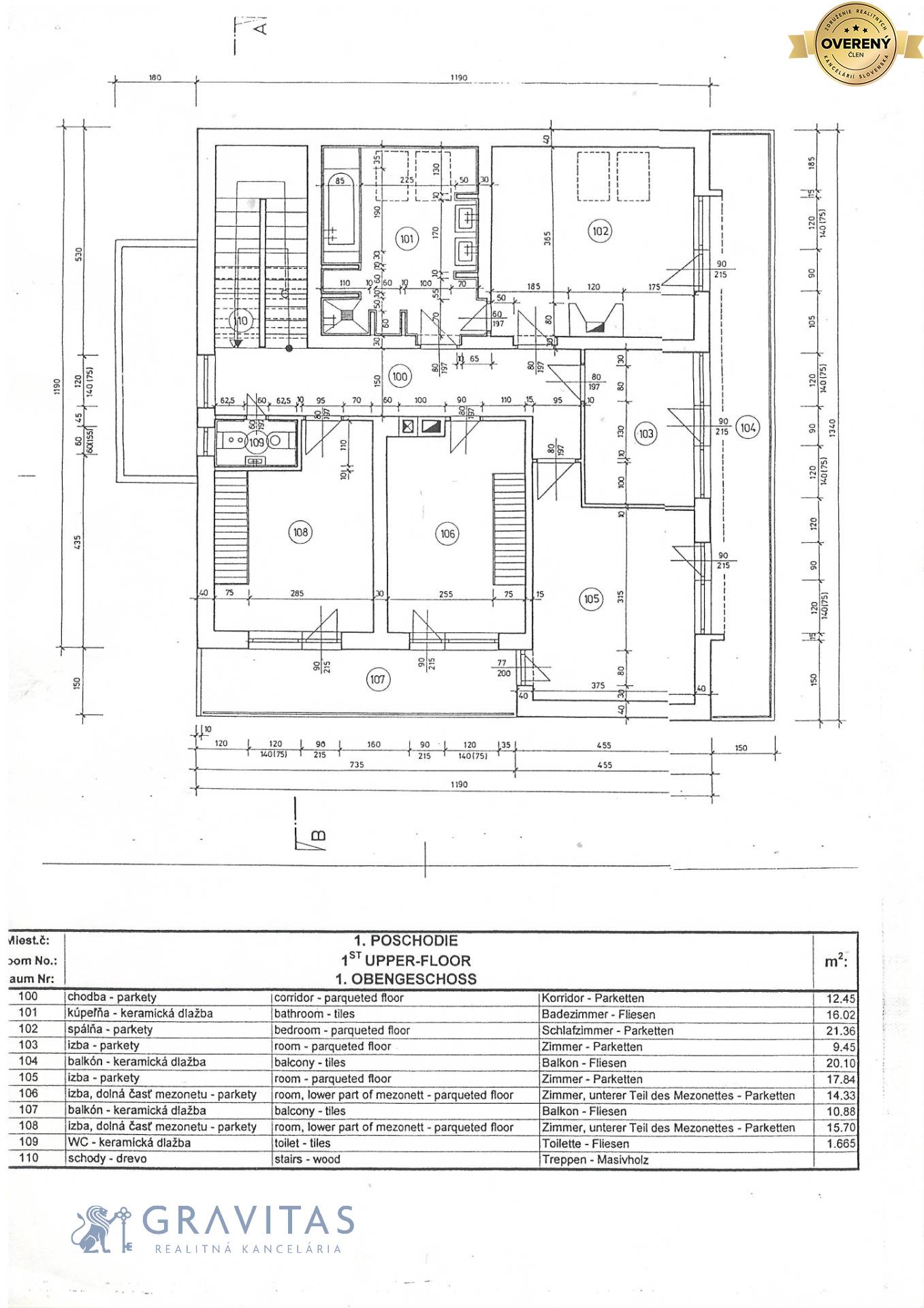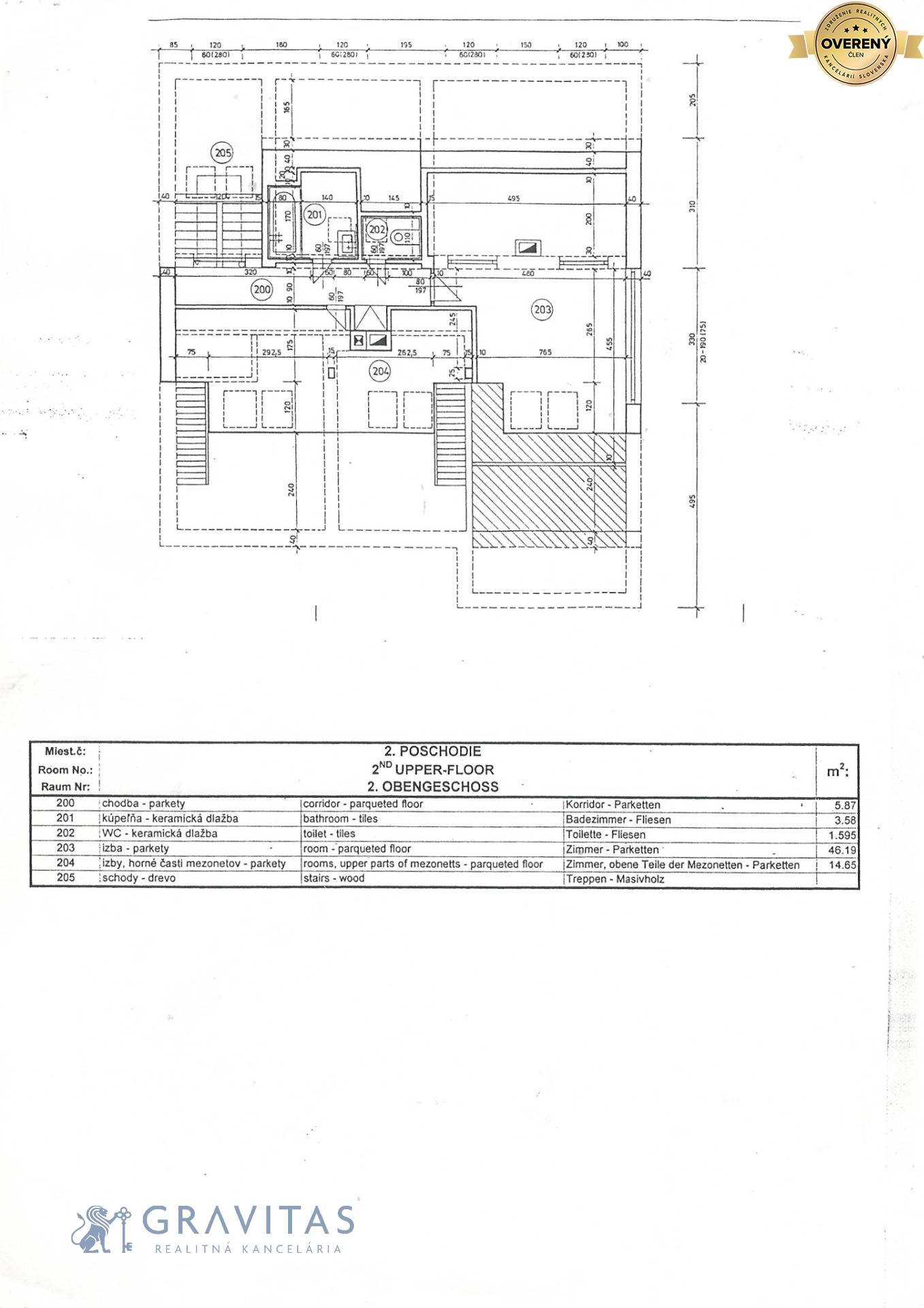 2. poschodie - disponuje vstupom do vrchnej časti do mezonetových spální, samostatnou kúpeľnou a samostatným WC. Taktiež sa tu nachádza najväčšia spálňa o výmere 46m2.