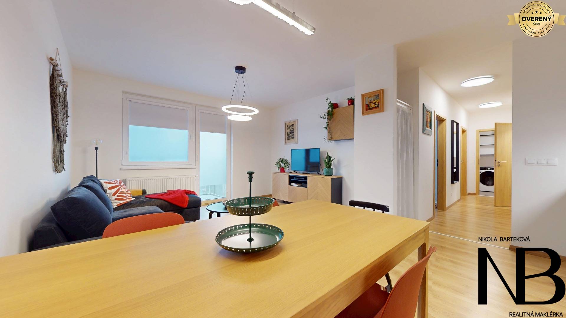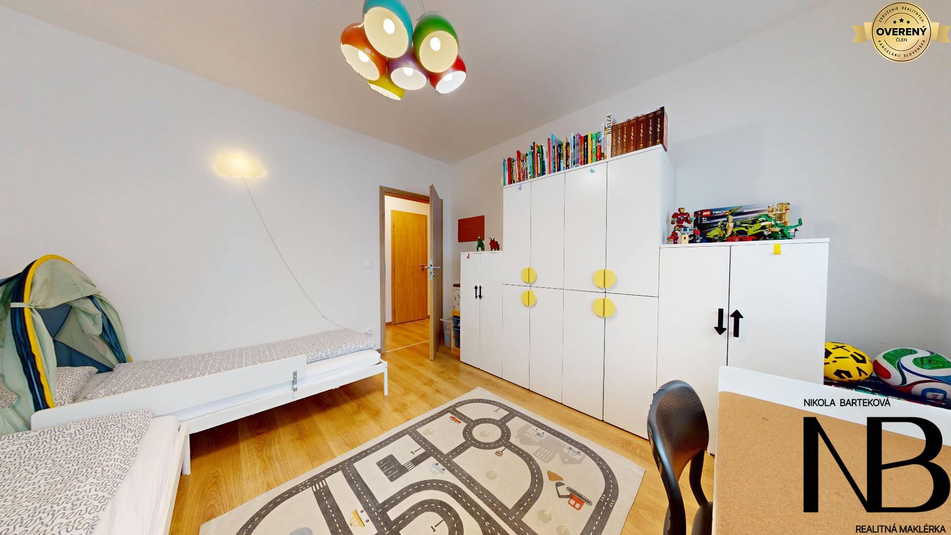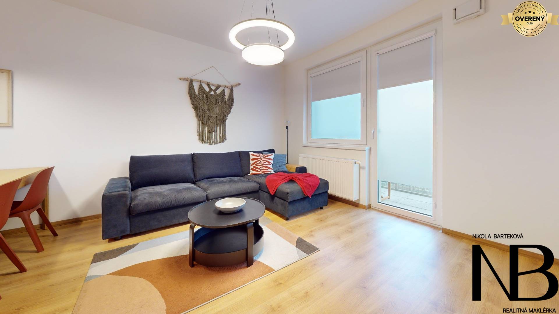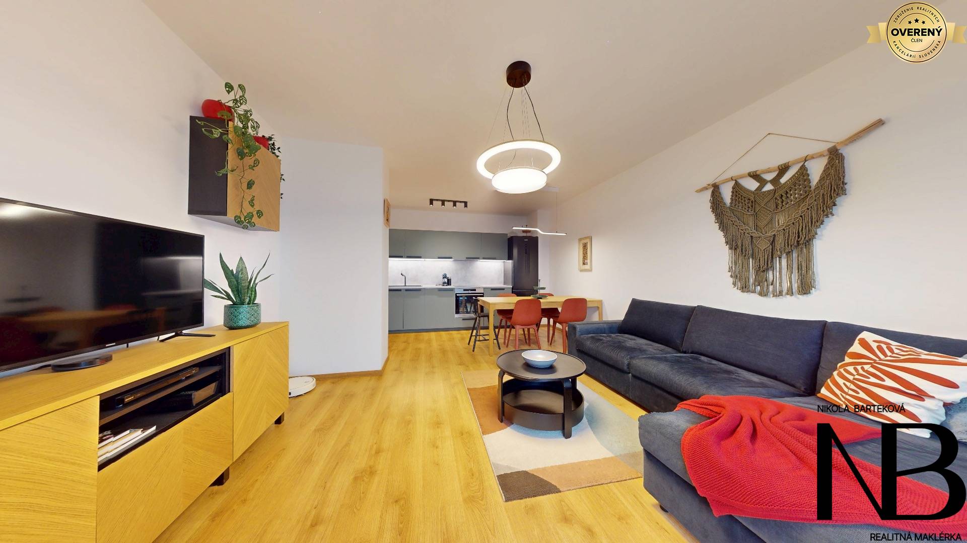 Dispozične je riešený veľmi prakticky – priestranná vstupná chodba poskytuje priamy vstup do každej miestnosti. Dominantou bytu je veľká kuchyňa prepojená s obývacou izbou, z ktorej je výstup na balkón. Súčasťou tohto priestoru je aj jedálenský kút, ideálny pre rodinné stolovanie. Kuchynská linka je vyrobená na mieru a disponuje vstavanými spotrebičmi – umývačkou riadu, elektrickou rúrou a voľne stojacou chladničkou. Spálňa ponúka dostatok úložného priestoru, zatiaľ čo detská izba je momentálne využívaná ako plnohodnotné kráľovstvo pre dve deti, s dostatkom miesta na hranie, učenie aj odkladanie vecí. Toaleta je oddelená a má vlastné umývadlo, kúpeľňa je vybavená vaňou. Komfort bývania zvyšuje rekuperácia v každej izbe, ktorá zabezpečuje zdravé a čerstvé vnútorné prostredie.