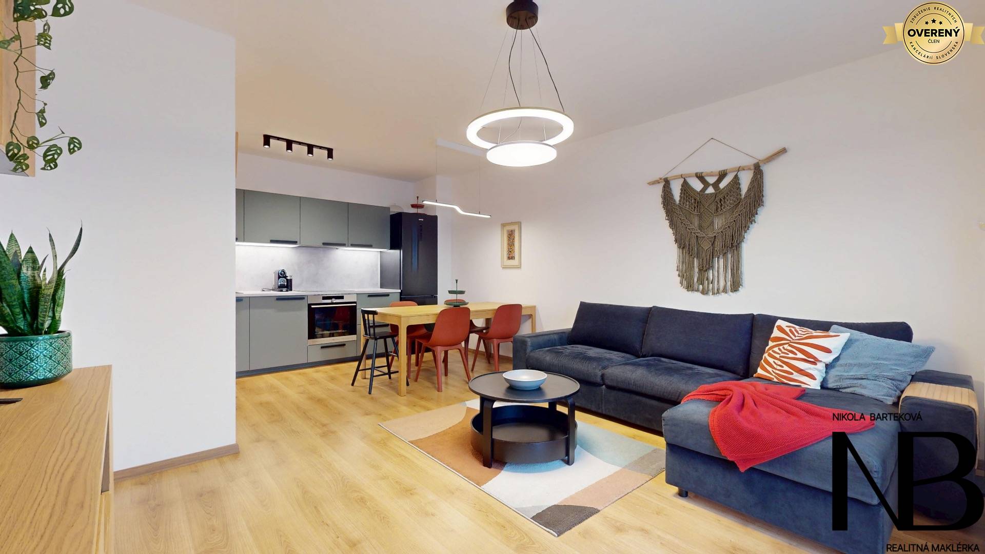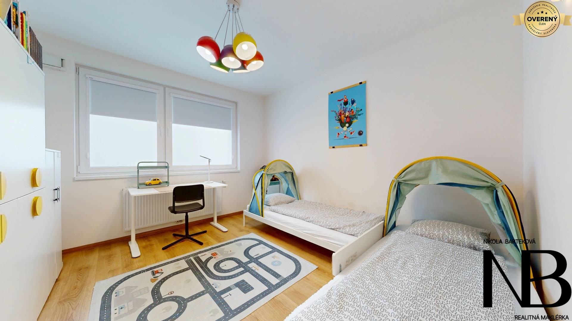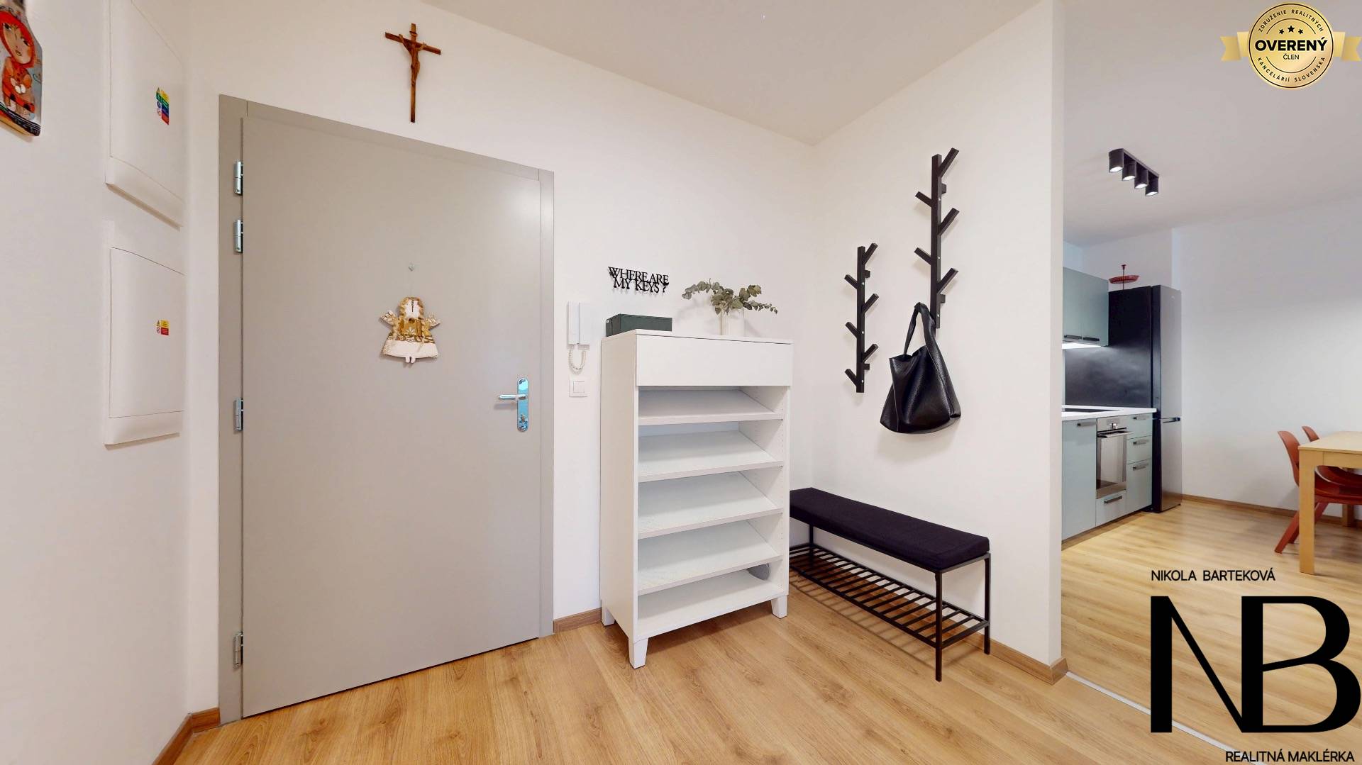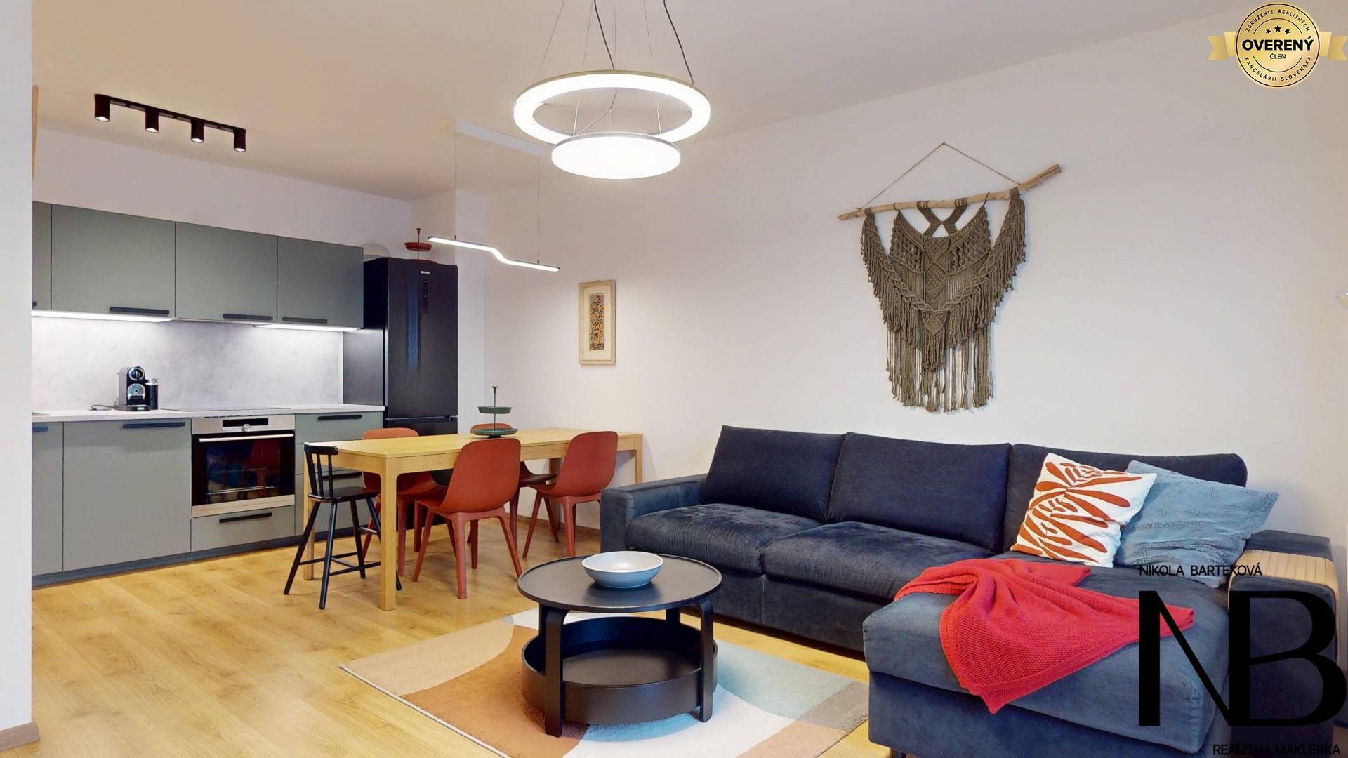 Dispozične je riešený veľmi prakticky – priestranná vstupná chodba poskytuje priamy vstup do každej miestnosti. Dominantou bytu je veľká kuchyňa prepojená s obývacou izbou, z ktorej je výstup na balkón. Súčasťou tohto priestoru je aj jedálenský kút, ideálny pre rodinné stolovanie. Kuchynská linka je vyrobená na mieru a disponuje vstavanými spotrebičmi – umývačkou riadu, elektrickou rúrou a voľne stojacou chladničkou. Spálňa ponúka dostatok úložného priestoru, zatiaľ čo detská izba je momentálne využívaná ako plnohodnotné kráľovstvo pre dve deti, s dostatkom miesta na hranie, učenie aj odkladanie vecí. Toaleta je oddelená a má vlastné umývadlo, kúpeľňa je vybavená vaňou. Komfort bývania zvyšuje rekuperácia v každej izbe, ktorá zabezpečuje zdravé a čerstvé vnútorné prostredie.