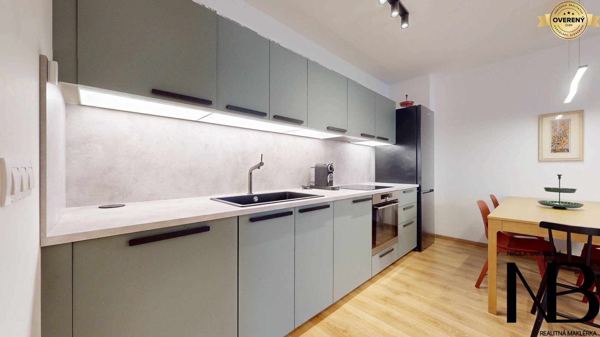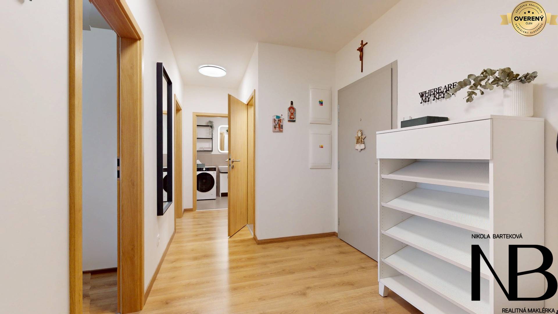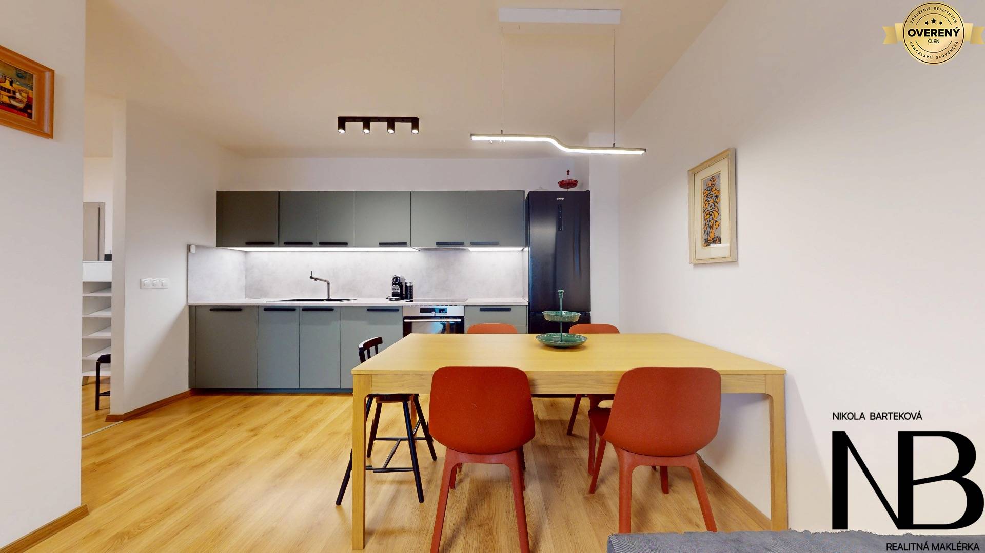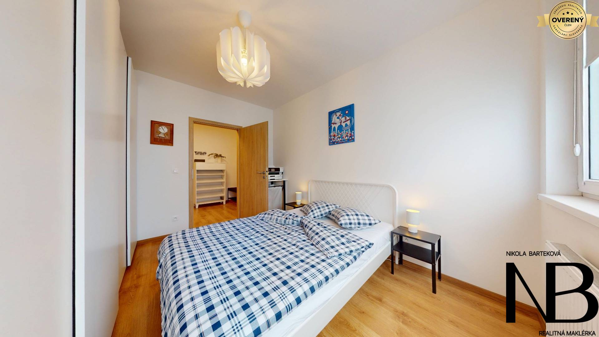 Dispozične je riešený veľmi prakticky – priestranná vstupná chodba poskytuje priamy vstup do každej miestnosti. Dominantou bytu je veľká kuchyňa prepojená s obývacou izbou, z ktorej je výstup na balkón. Súčasťou tohto priestoru je aj jedálenský kút, ideálny pre rodinné stolovanie. Kuchynská linka je vyrobená na mieru a disponuje vstavanými spotrebičmi – umývačkou riadu, elektrickou rúrou a voľne stojacou chladničkou. Spálňa ponúka dostatok úložného priestoru, zatiaľ čo detská izba je momentálne využívaná ako plnohodnotné kráľovstvo pre dve deti, s dostatkom miesta na hranie, učenie aj odkladanie vecí. Toaleta je oddelená a má vlastné umývadlo, kúpeľňa je vybavená vaňou. Komfort bývania zvyšuje rekuperácia v každej izbe, ktorá zabezpečuje zdravé a čerstvé vnútorné prostredie.