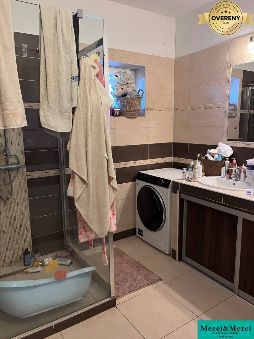 - kúpeľňa so sprchovým kútom, dvoma umývadlami a práčkou so sušičkou