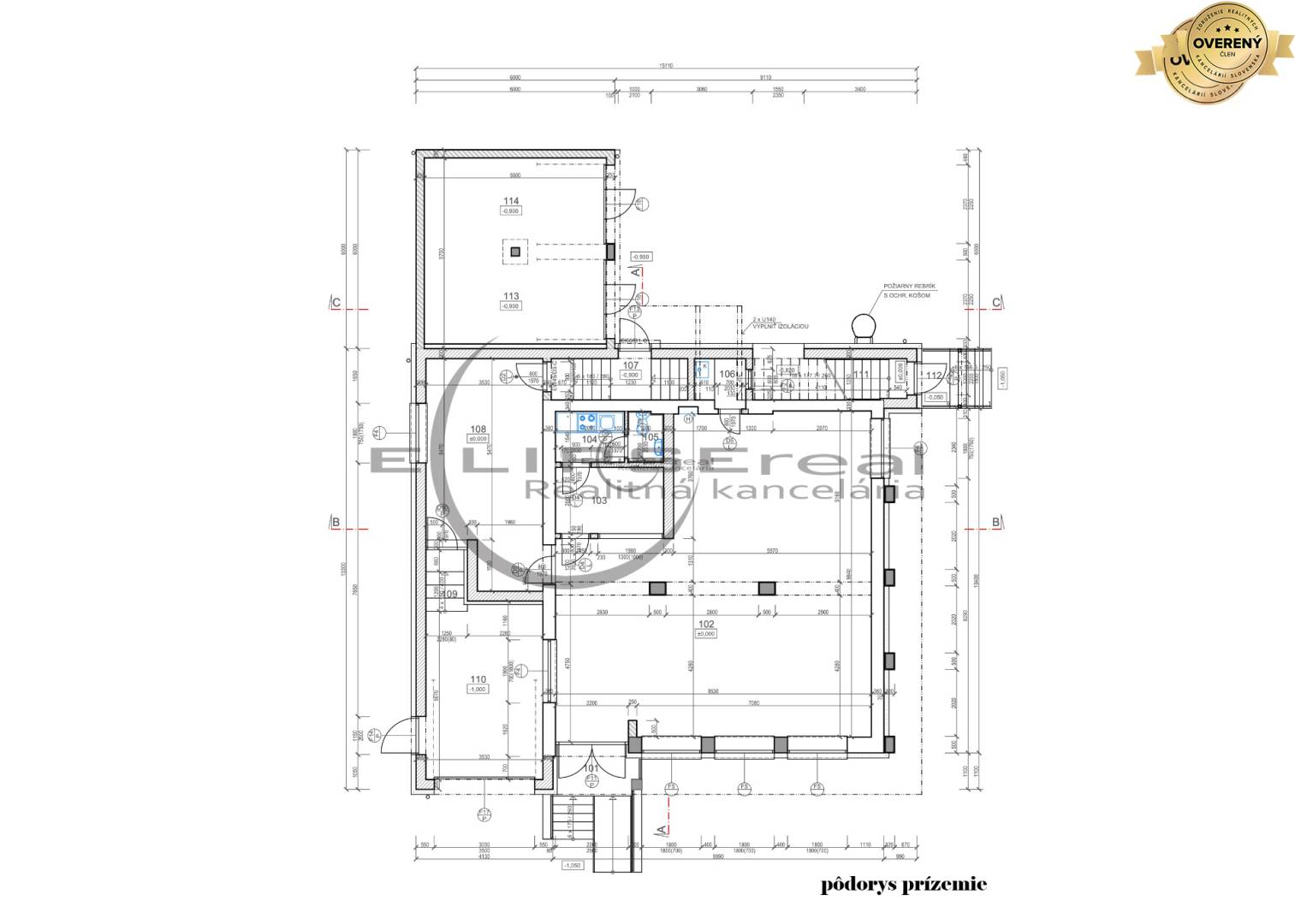 - prízemie: centrálne situovaná vstupná hala s priestorovo bohatým obchodným priestorom, kanceláriou, kuchynkou, toaletou, technickou miestnosťou, skladovým priestorom a schodiskom spolu o výmere 120,67 m2,