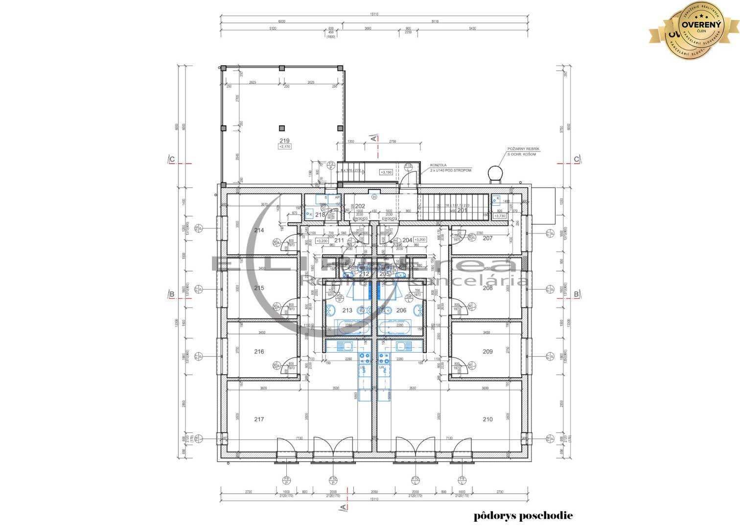 - poschodie: schodisko a spoločná chodba s vchodom na spoločnú vonkajšiu terasu o výmere cca 40 m2 a do dvoch samostatných 4-izbových bytov (byt č. 1 o výmere 77,06 m2 a byt č. 2 o výmere 82,96 m2),