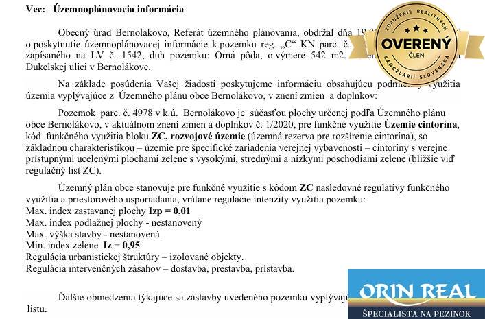 Pozemok je vedený ako Orná pôda s rozlohou 542m2 s posuvnou bránou 4,5m, vyčistený, celý oplotený, je prioritne určený na podnikanie v oblastí pohrebnictva.