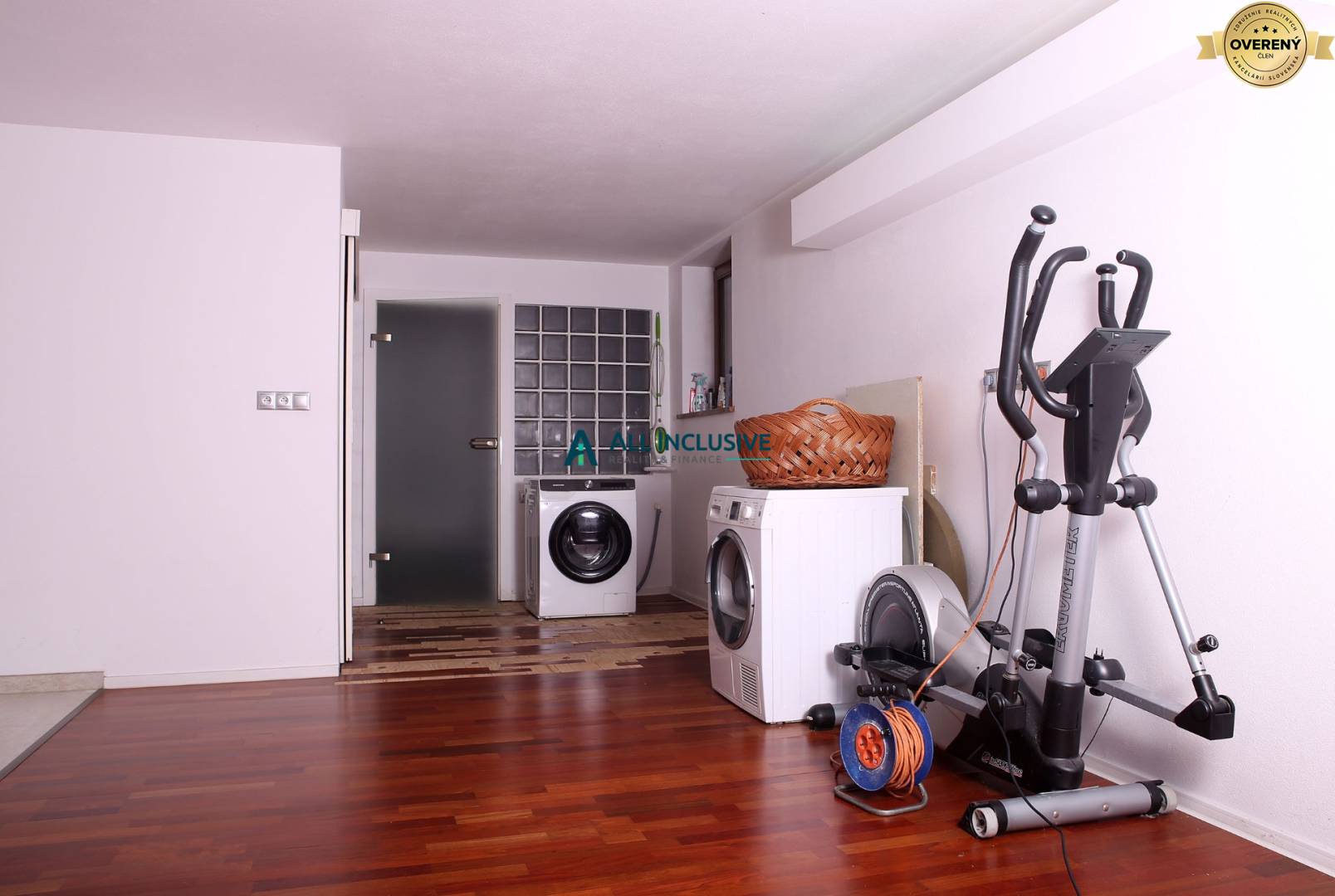 ● Nižšie podlažie je prístupné po schodoch a nachádza sa tu väčšia miestnosť slúžiaca ako práčovňa, kúpeľňa so sprchovým kútom, WC, samostatná izba využiteľná ako obývačka, spoločenská miestnosť alebo relaxačný priestor.