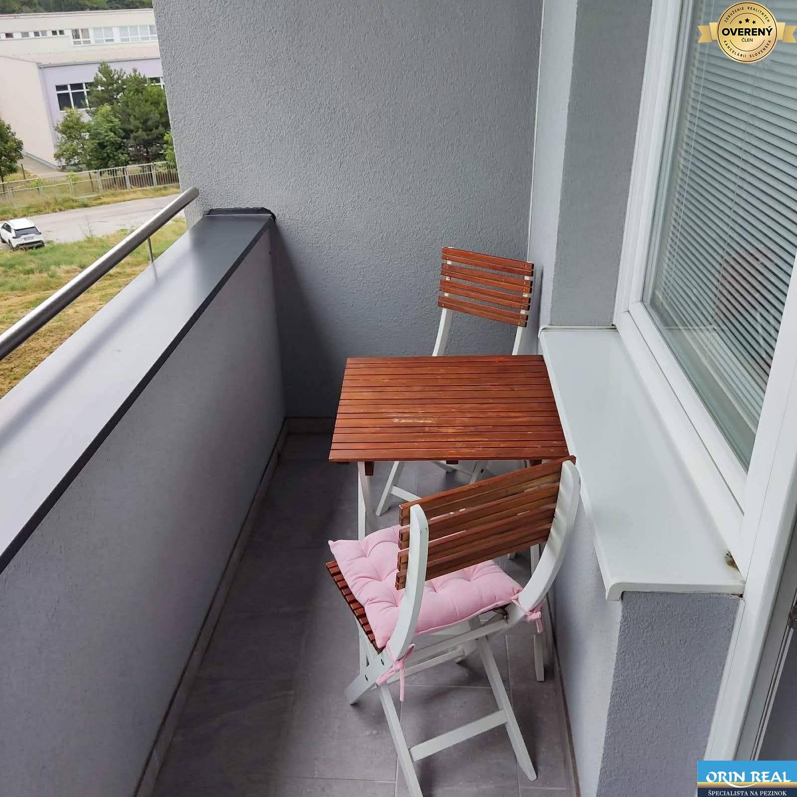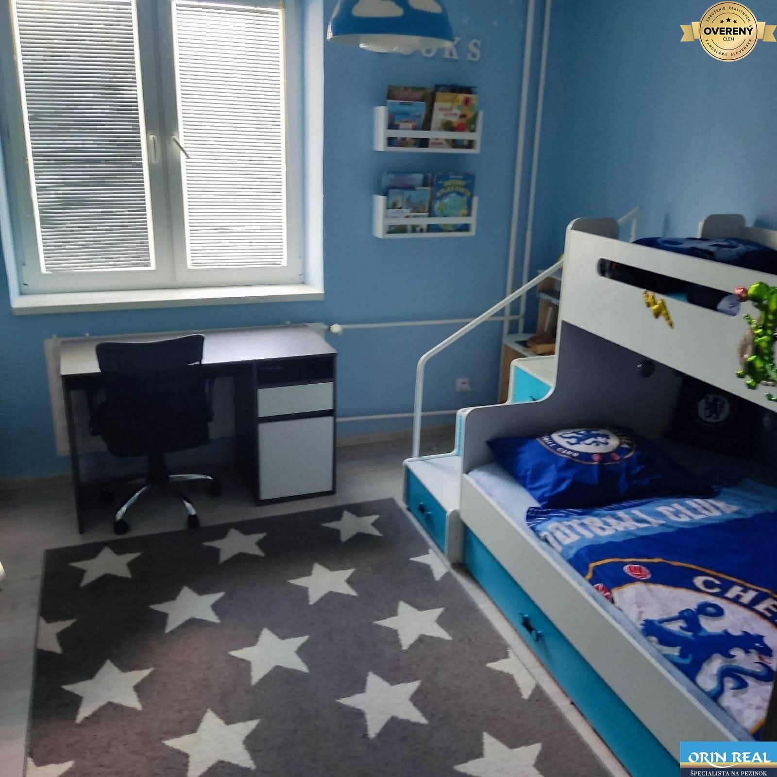 Zariadený je ako na fotkách: kuchynská linka na mieru so vstavanými spotrebičmi - plynová varná doska, rúra, mikrovlnka, umývačka riadu, práčka, sušička, sedačka, jedálenský stolík so stoličkami, detská posteľ v izbe a nábytok písací stol, skrine, komody, botník s vešiakovou stenou v chodbe, manželská posteľ a skrine v spálni, tv, stolík so stoličkami na loggii.