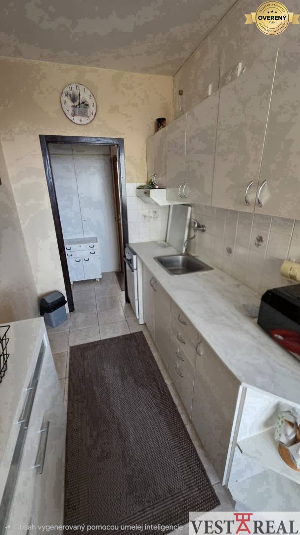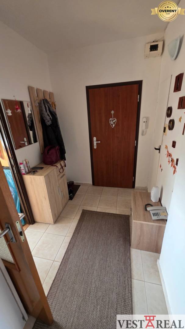 Vstupná chodba, obývacia izba s výstupom na balkón, samostatná kuchyňa s veľkou komorou, spálňa, detská izba, kúpeľňa, samostatné WC a špajza.
