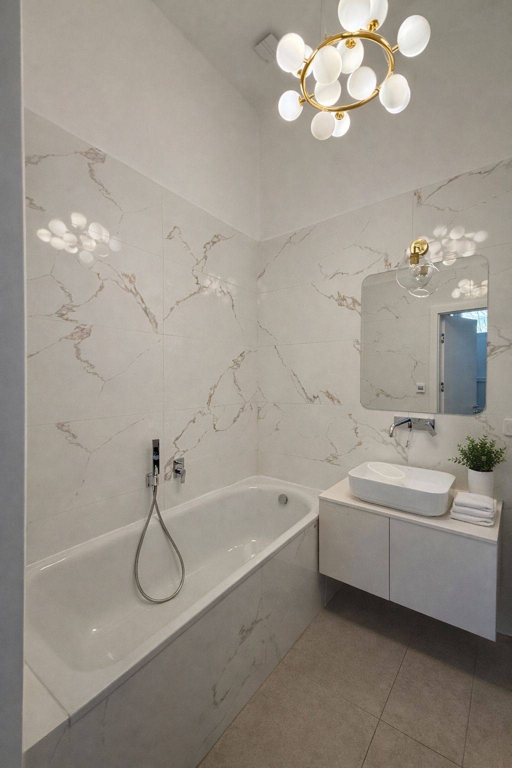 Vstupom do bytu sa dostávame do vstupnej chodby, ktorá umožňuje priamy vstup do jednej zo samostatných izieb a do kúpeľne vybavenej vaňou, práčkou ,sušičkou, toaletou a podlahovým kúrením.
