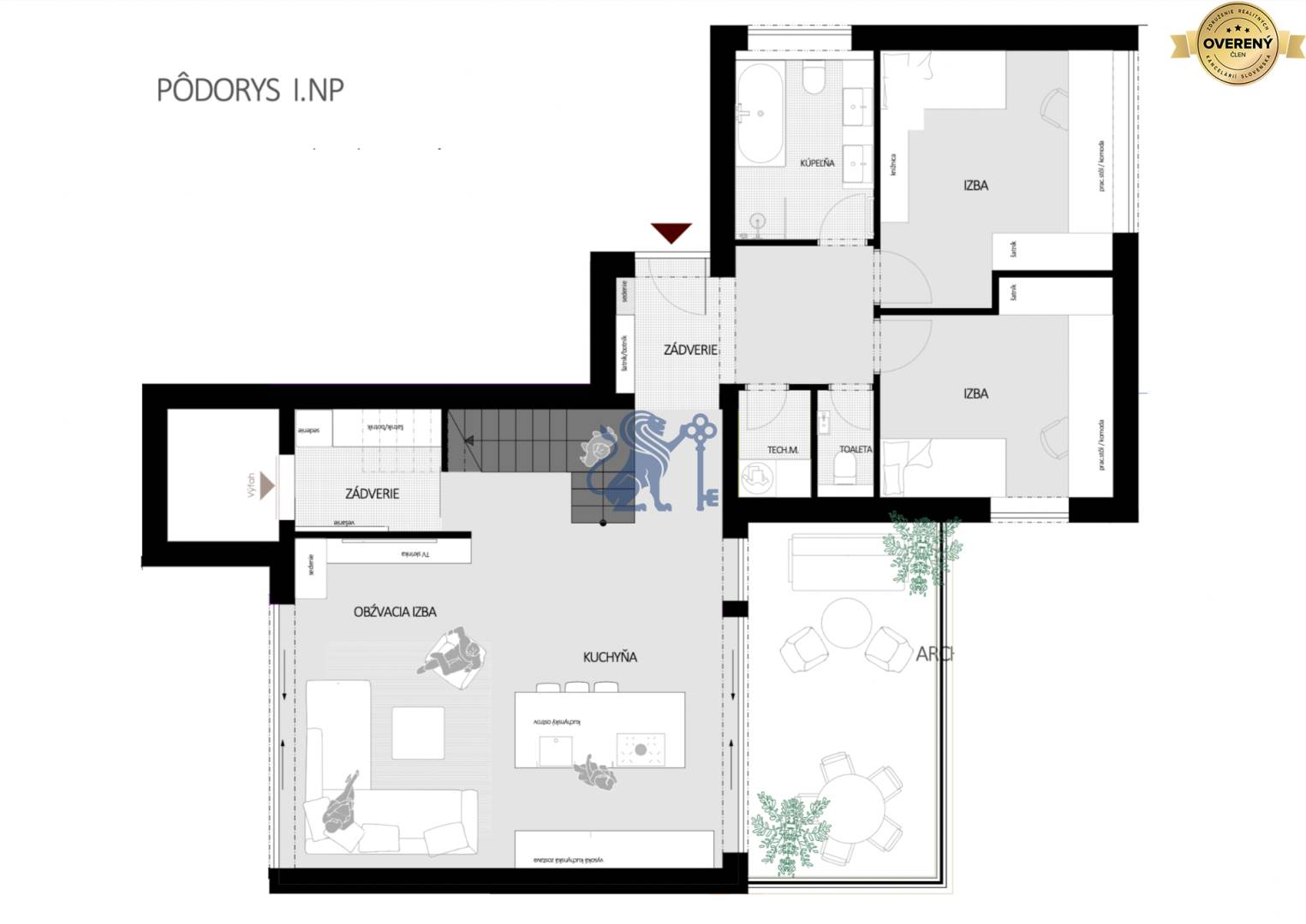 - 1.NP: vstup so zádverím, veľká obývačka s kuchyňou a výstupom na terasu aj do záhradky, schodisko a výťah, 2 izby, kúpeľňa s wc, samostatné wc a technická miestnosť