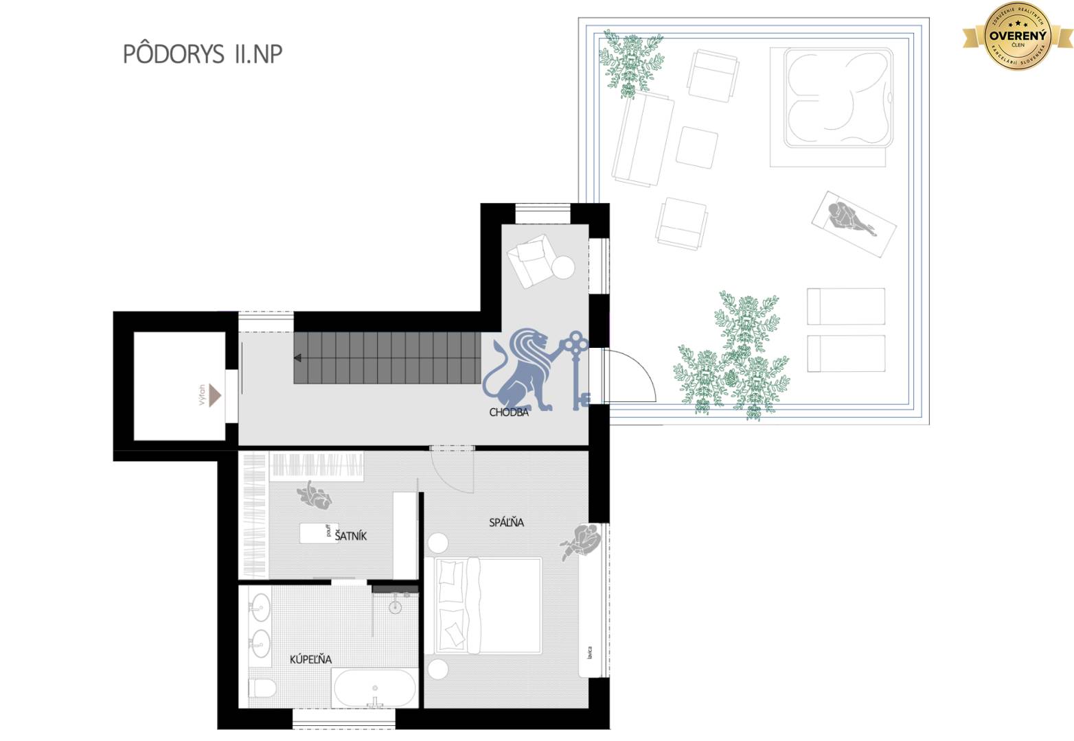 - 2. NP: spálňa s veľkým šatníkom, vlastnou kúpeľňou, chodba s výstupom na terasu