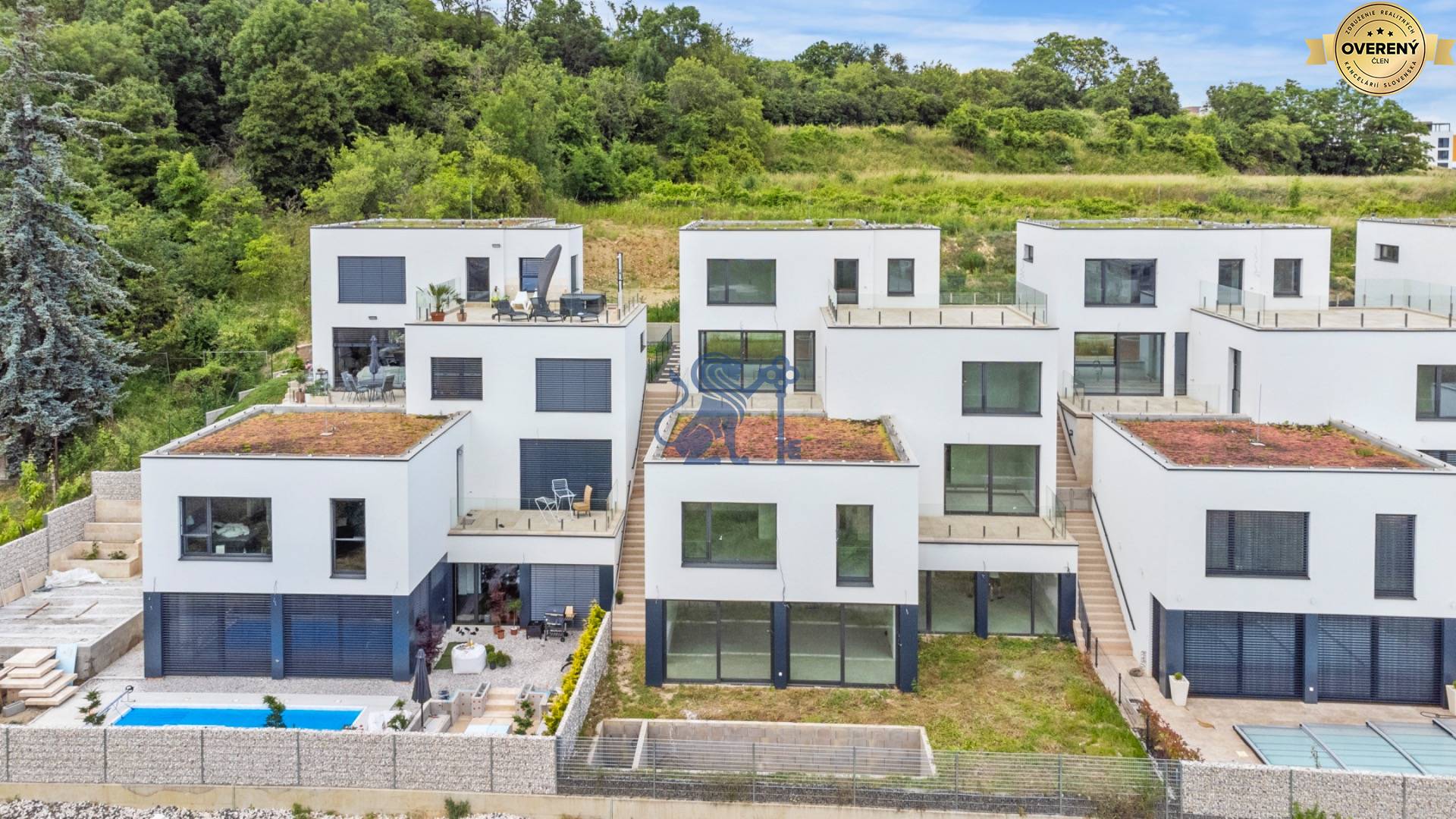 - nadštandardné materiály: hliníkové okná, smart wifi vypínače, sklenené zábradlia, výťah (Otis), tepelné čerpadlo, podlahové kúrenie, stropné chladenie