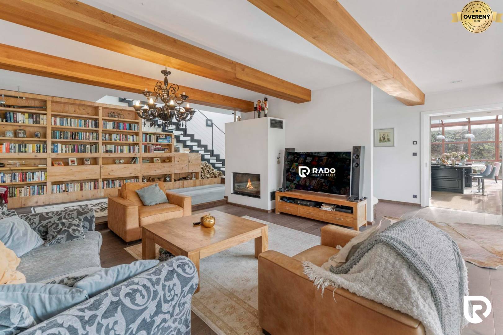 Interiér je kompletne zariadený elegantným luxury farmhouse štýlom v ktorom dominujú príjemné zemité tóny a biela.