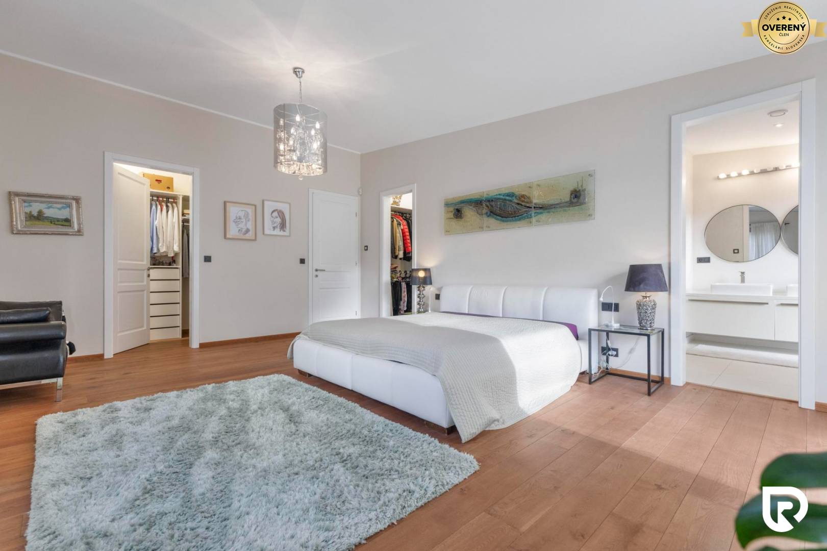 Prvé poschodie je kompletne venované súkromnej časti majiteľov. Výraznú časť poschodia tvorí rodičovská časť, zložená z master bedroom spolu s dizajnovou, otvorenou kúpeľňou so sprchovým kútom a vaňou a dvomi veľkorysými walk-in šatníkmi pre každého zvlášť. Zo spálne je priamy vstup na terasu s výhľadom na Malé Karpaty.